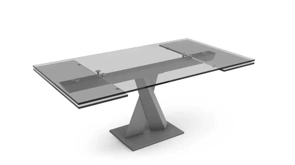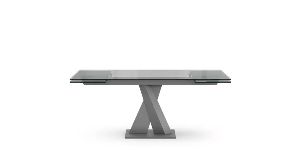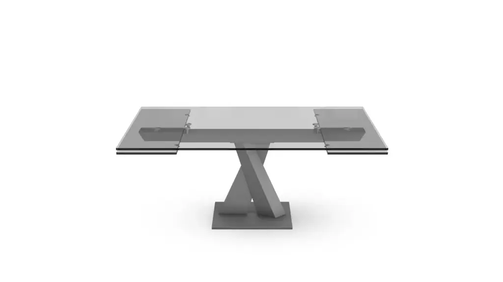 Hatano Hyoshiaru designed this functional yet elegant dining table. The top is made in glass or ceramic and placed on a central base of two crossed steel tubes. The two 40 cm extension leaves can increase the length of the top by 80 cm.