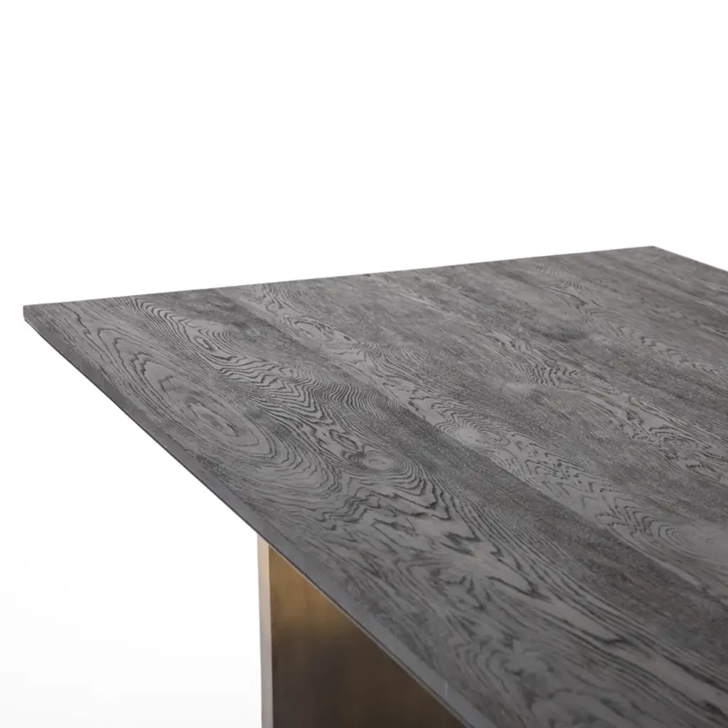 Wide, plank-style legs of brass-finished stainless steel feature an ombre pattern for eye-catching effect, with an intersecting beam adding intrigue. A rectangular black oak tabletop flaunts its materials' natural graining, for a richly organic takeaway.