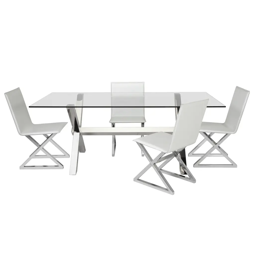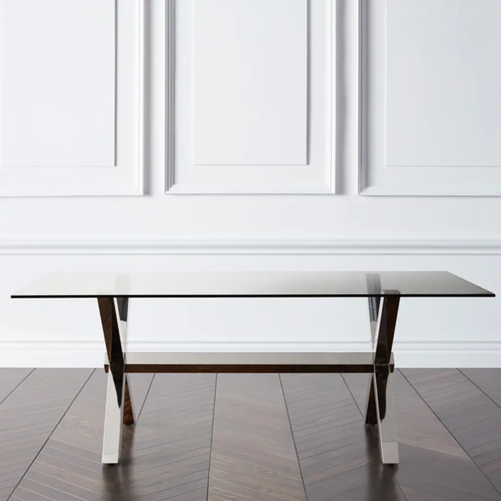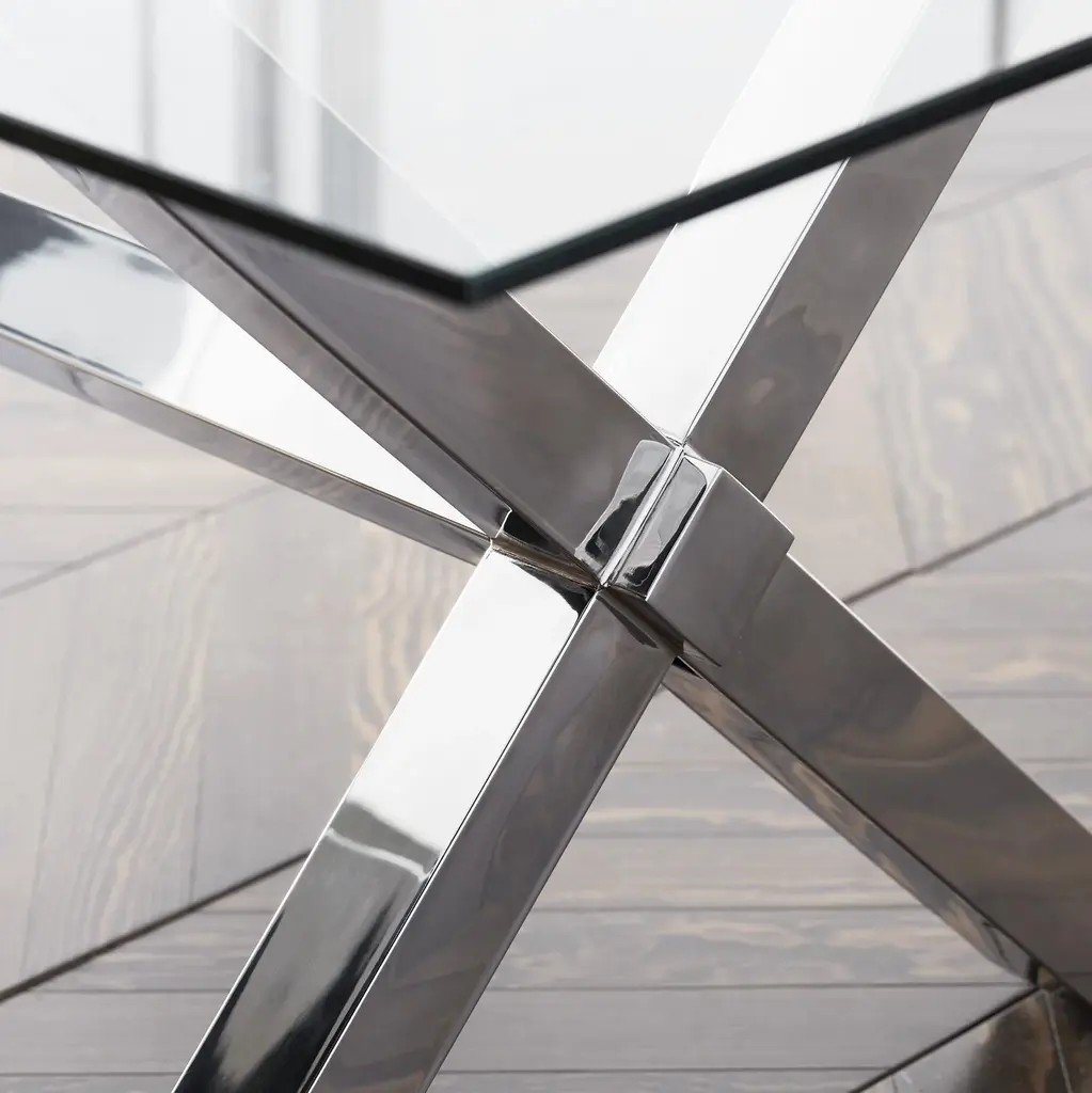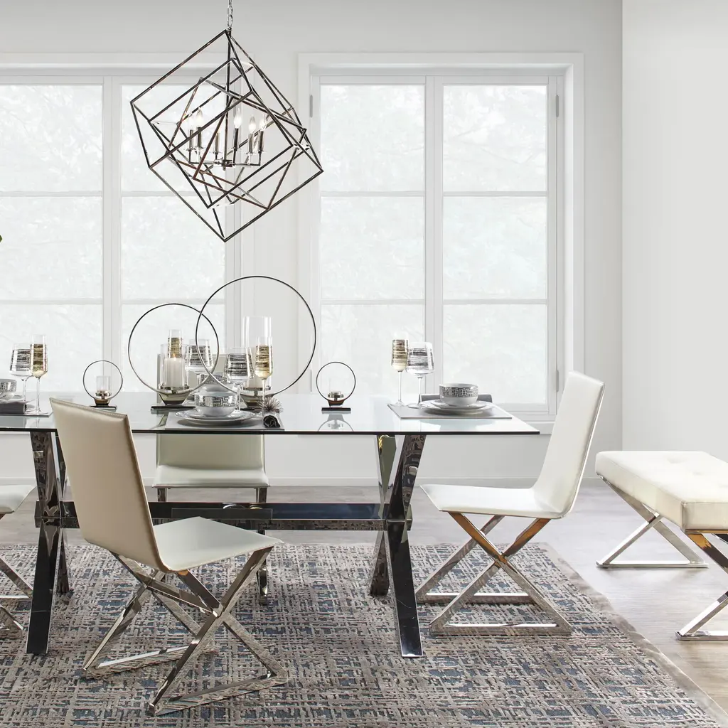 Our Axis dining table conveys a contemporary design through its lustrous finishes. A polished stainless steel base and glass top both highly reflective surfaces are a perfect complement to a modern dining room. 78"W x 38"D x 30.5"H Seats up to 6 guests comfortably. Z Gallerie exclusive.