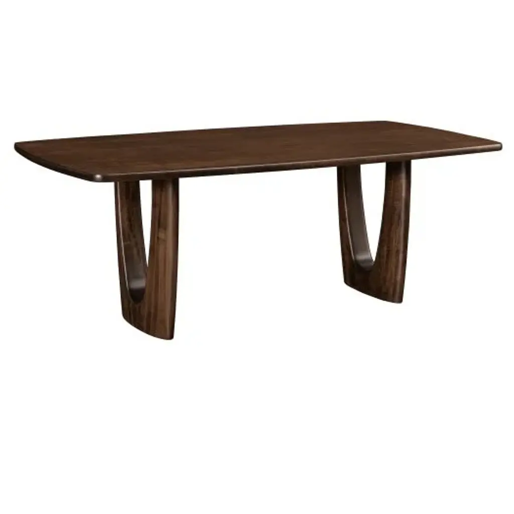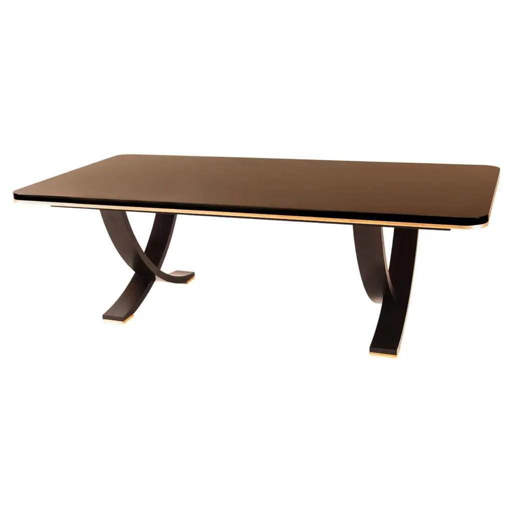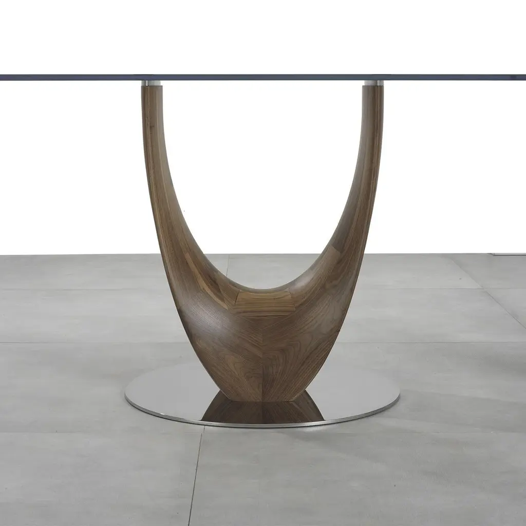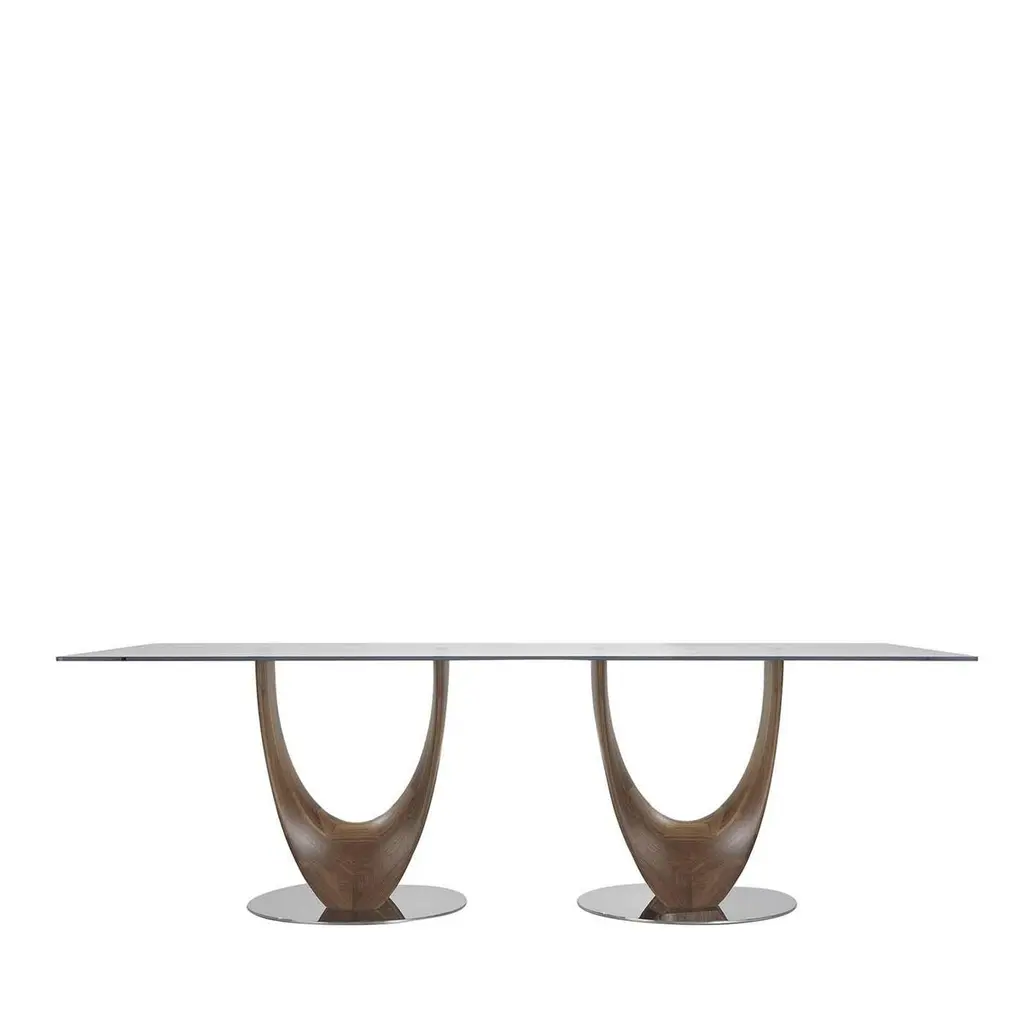 This stunning dining table is part of the Mobius collection designed by Stefano Bigi. The elegant top is a rectangle in tempered glass and electro-welded supports (available with a thickness of either 10 or 12 mm, also in clear). Underneath it, two striking double curves in Canaletto walnut stained in wenge create two sinuous curves that add a sense of movement to the piece, raising from two round bases in chrome-plated metal. The effect is modern and refined and of strong impact. Other finishes are available.