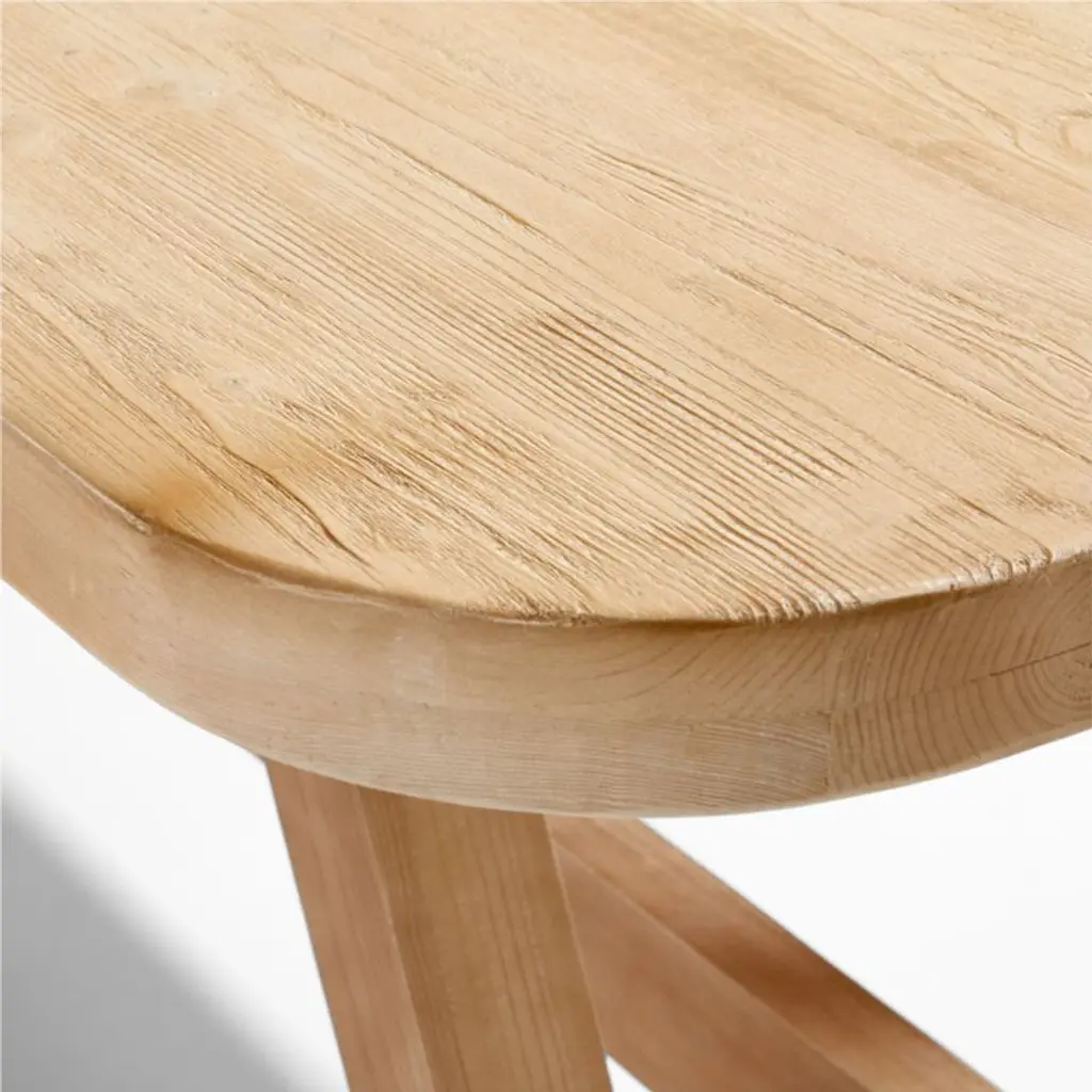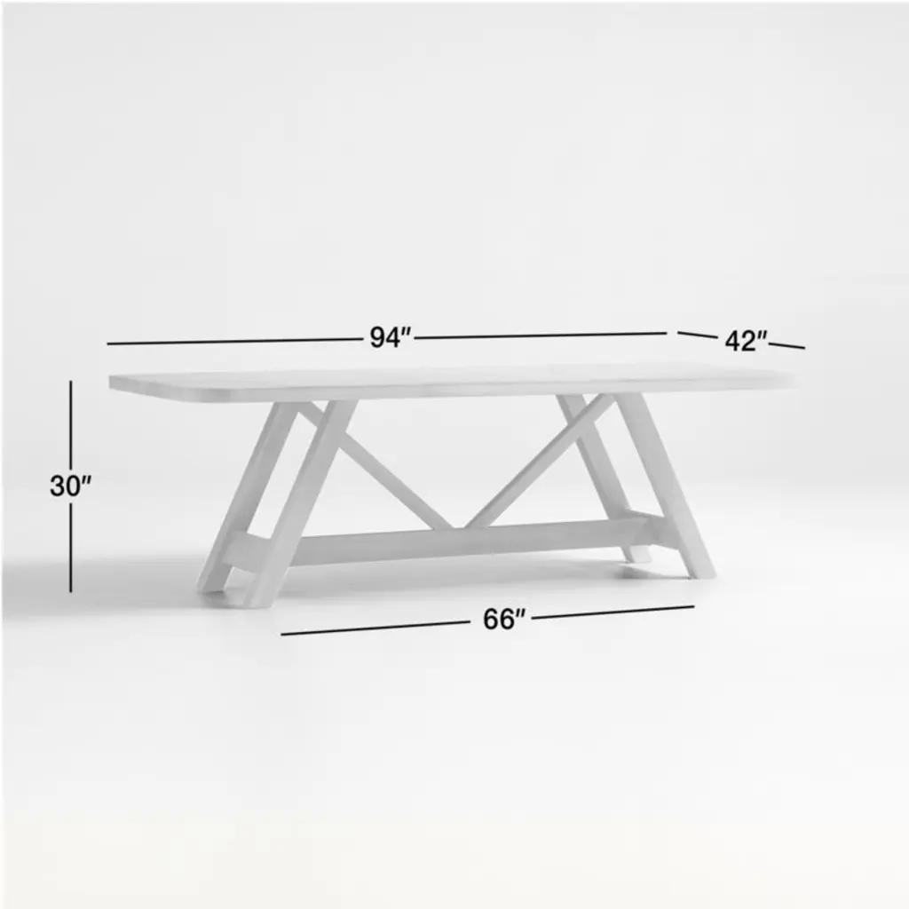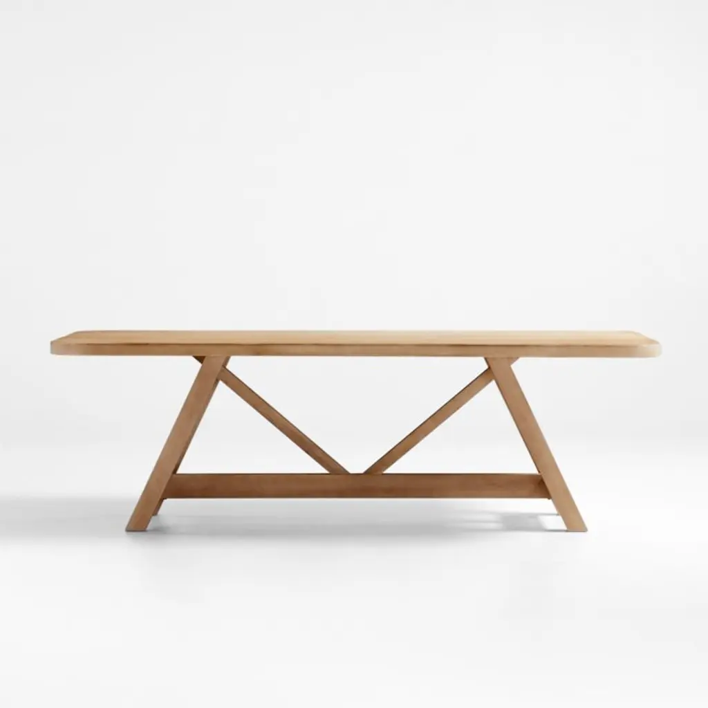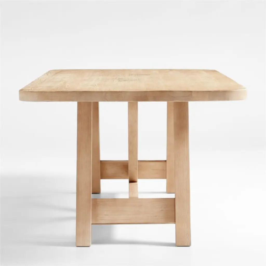 Call it architectural casual. Angles, slants and straight edges draw the eye to Aya's trestle base, while the simple plank top recalls the well-worn look of a farmhouse table. Made of solid pine, the table gets its rustic look from wirebrushing to bring out the grain. Treated to natural finish and a light lacquer topcoat, the wood table is intended to develop its own unique lived-in character and rich patina over time.Part of the Leanne Ford furniture collection, exclusive to Crate and Barrel. A rising design star with a motto we can get behind"paint white, wear black"Ford created pieces that capture her cool, artful vibe.