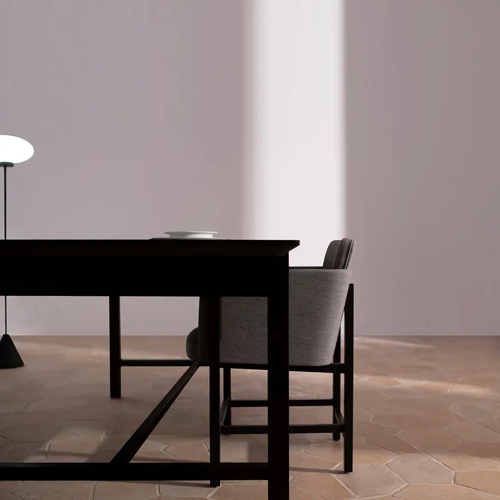 Aya is an onomatopoeia – a word that mimics a phonetical sound. A poetic name as soft and sophisticated as the design itself. The collection design language is an elaboration of the encounter between Asian and Scandinavian design. Aya is minimal yet highly complex and every detail has been careful orchestrated, from the small wooden joints and angles to the stitching and seating comfort. The elegant light wooden frame is deeply inspired by Asian culture and design, and effortlessly carries the soft and embracing shell and seat. The result is a full range of Aya furniture for the perfect dining and socializing setting. Comfort and sturdy durability lie at its core, which is complimented by the elegant appearance. The first Aya collection drop comprises a fully upholstered dining chair with armrest, a dining chair without armrests, and two dimensions of dining tables: 1,800 cm and 2,400 cm in length. The design of the tables mirrors the structure and details of the chair frame.