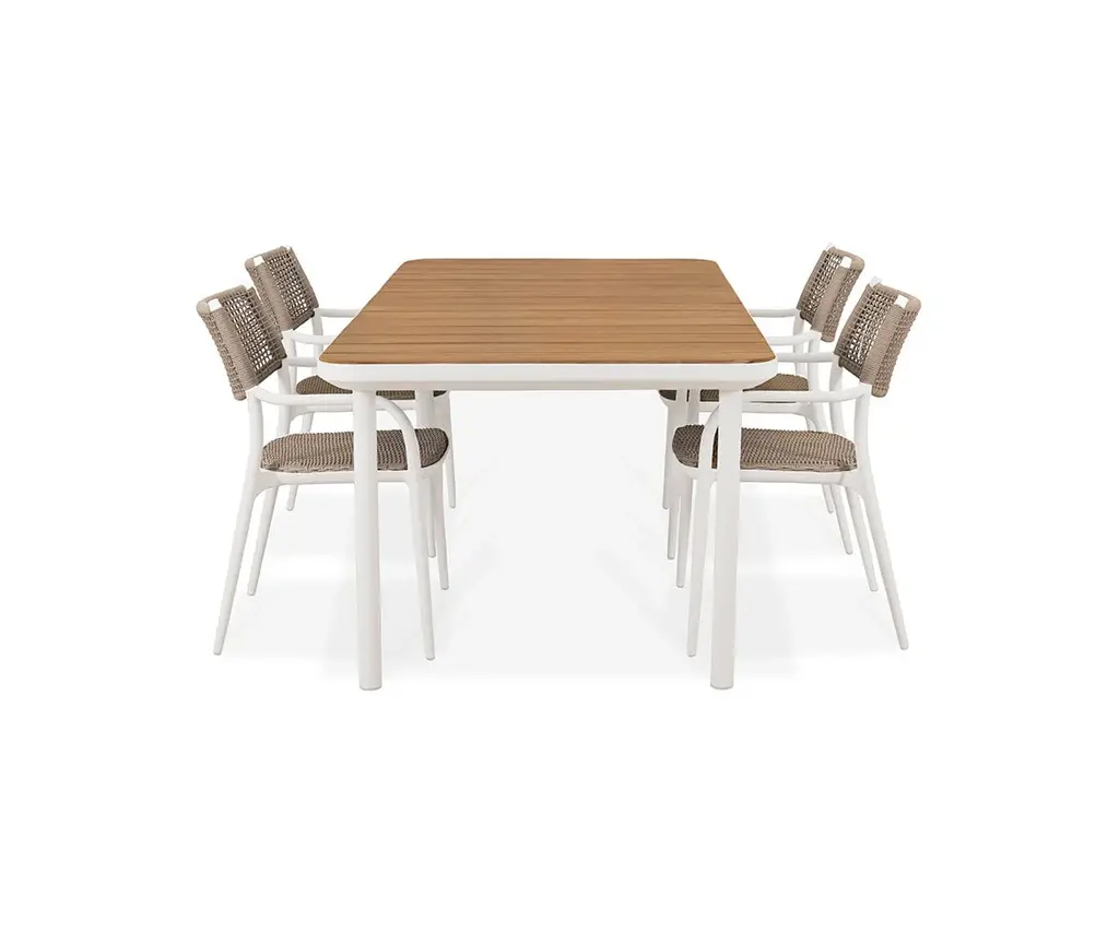 Teak tabletop Aluminum legs with a powder-coated white finish Keep in a fully shaded area