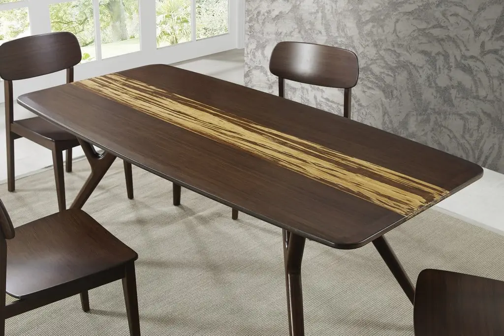 Expertly crafted in earth friendly solid bamboo, the Azara dining table by Greenington features sleek mid-century design with modern architectural lines, great legs, and a table top accent of exotic tiger bamboo. The Azara dining table by Greenington features contemporary styling, clean lines and beautiful accents in exotic Tiger bamboo. Crafted in 100% solid bamboo, the planet’s most eco-friendly and rapidly renewable resource. Available in your choice of classic Caramelized or rich Sable finish. See the entire collection here. Expertly crafted in earth friendly solid bamboo, the Azara dining table by Greenington features sleek mid-century design with modern architectural lines, great legs, and a table top accent of exotic tiger bamboo. Shown in rich Sable finish with accents in exotic Tiger bamboo. No stain is used in the production of exotic Tiger bamboo, the colors are achieved with heat and pressure. Exotic Tiger combines the light and dark material, creating a unique and beautifully striped grain with continuous colors throughout. No two pieces are exactly alike. Variation in grain and color enrich the natural beauty of bamboo furniture and make each piece unique. Slight differences in bamboo shade colors are signs that the furniture has been crafted from solid bamboo and is considered a benchmark of quality. The Azara dining collection makes it easy for you to promote sustainability in a lovely, classic and functional way in your home.