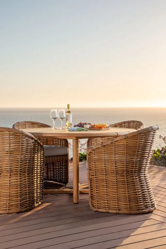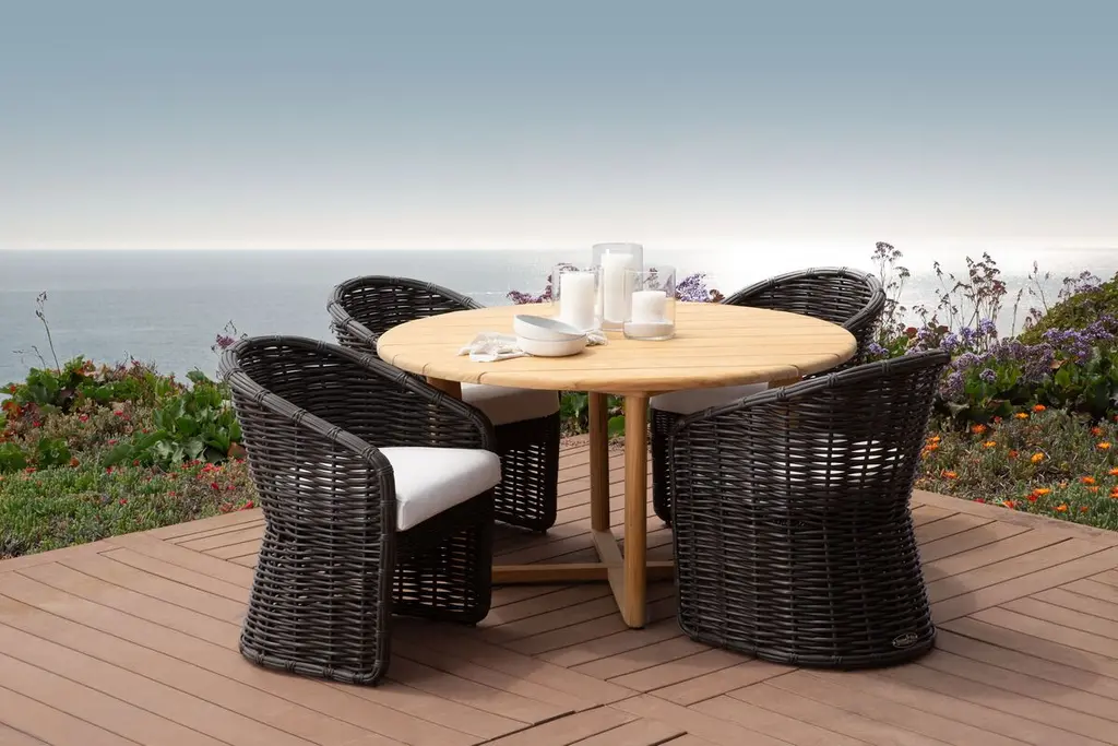 The natural teak Azalea Dining Table is constructed of 100% solid teak wood. These excellently engineered pieces develop a lovely patina over time. Their natural grooves lend a unique look and character to each item, no two pieces are exactly alike. Teak wood, known for its durability and natural moisture-resistant oils, is an excellent choice for outdoor furniture that will stand the test of time.