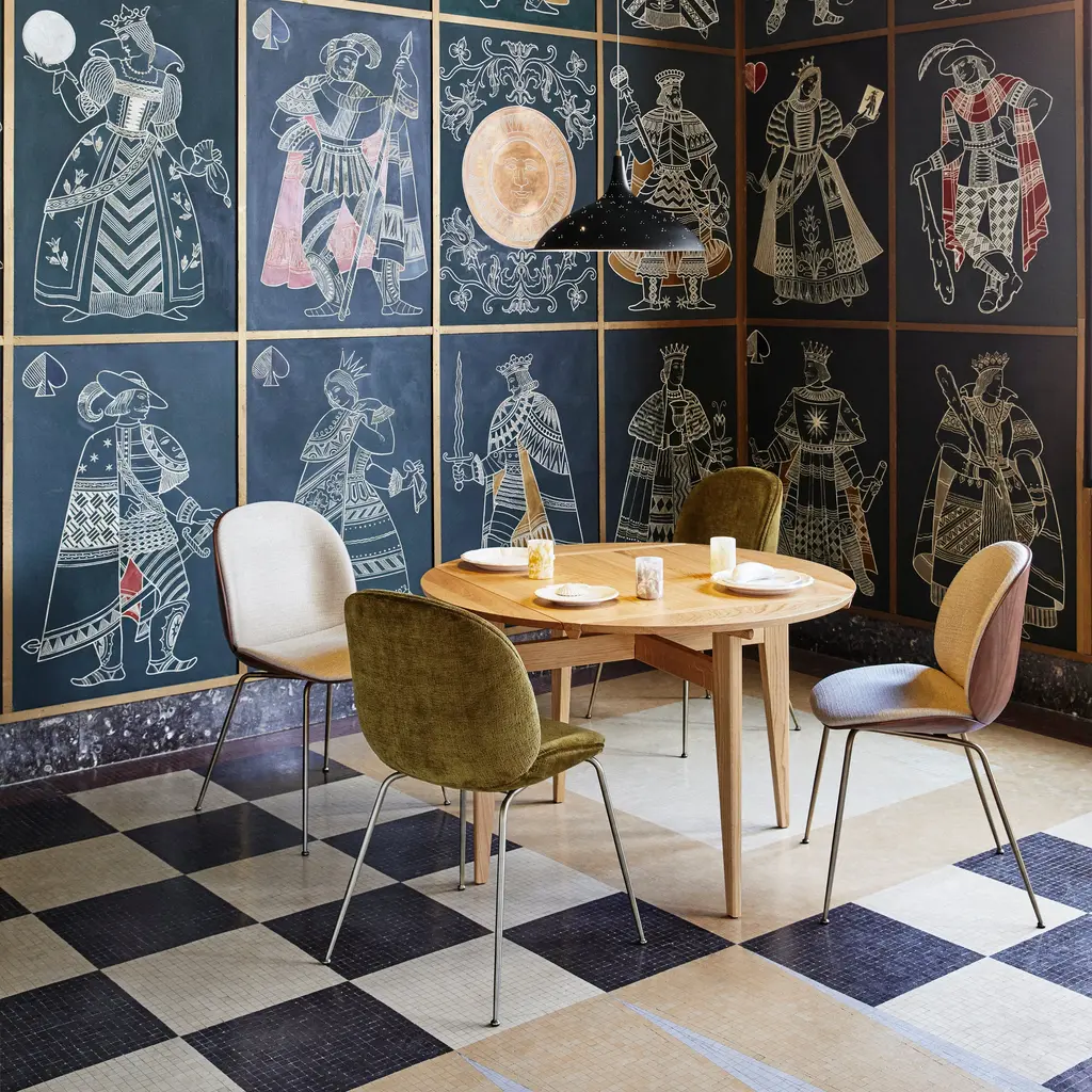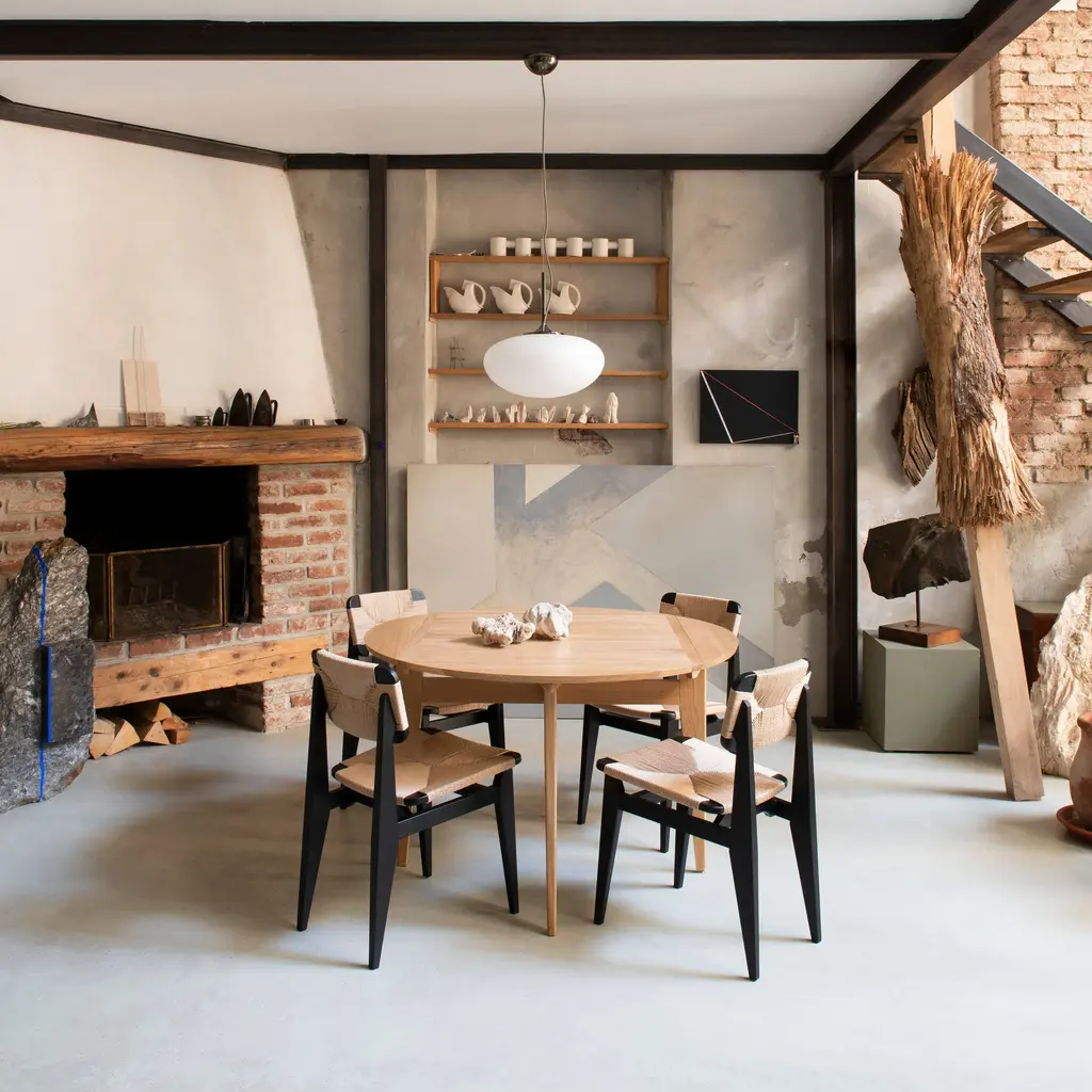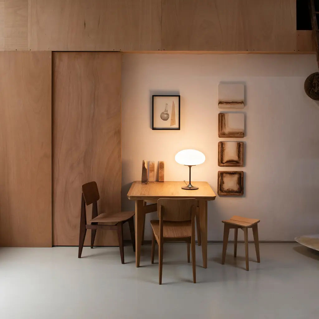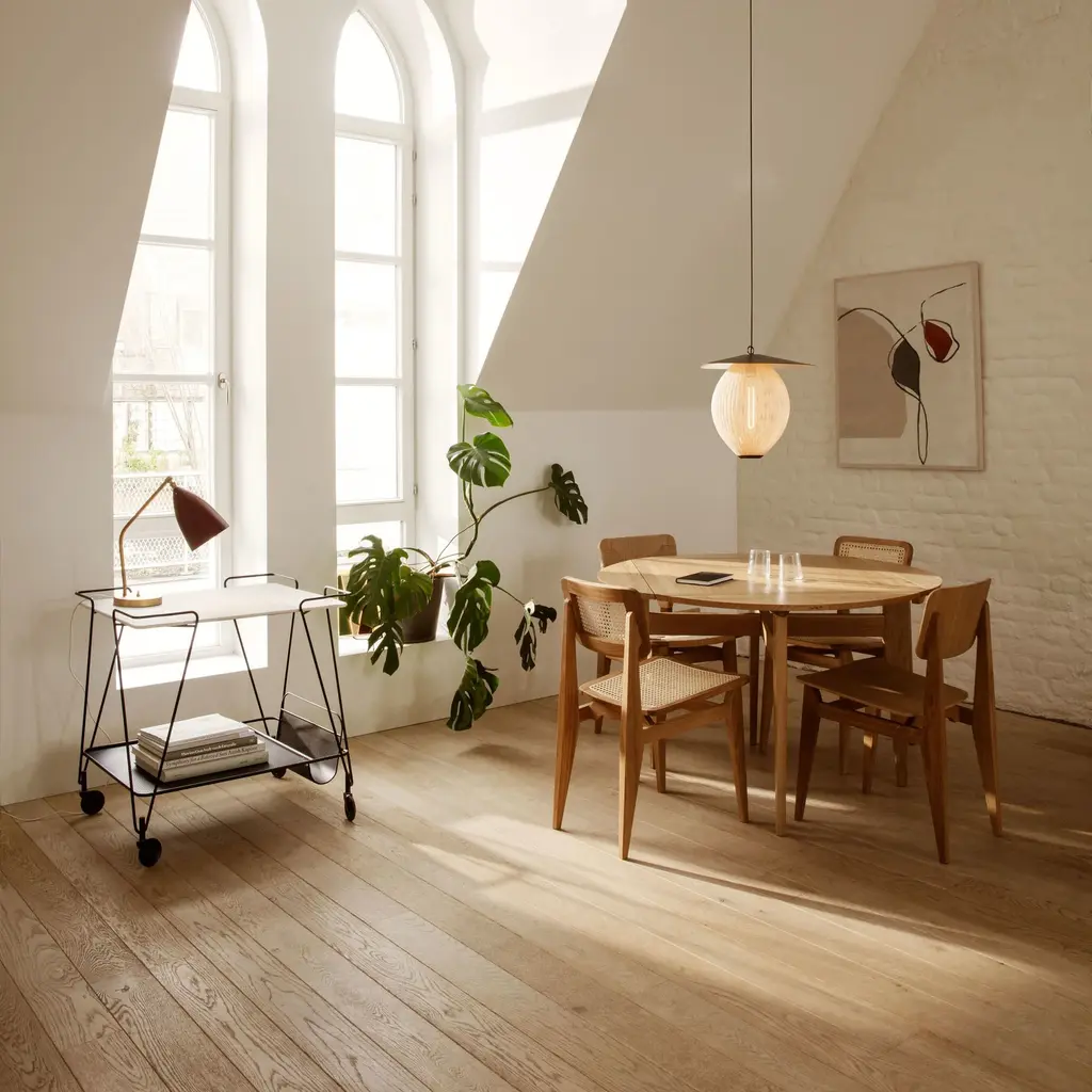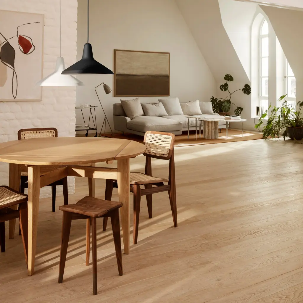 Reimagined by Gubi for contemporary multitasking spaces, midcentury designer Marcel Gascoin's elegantly simple B-Table was originally inspired by space-saving techniques typically found in boat design. A single fluid motion using a clever magnetic mechanism transforms the square work table into a round surface to seat up to 6. Faultlessly crafted in a choice of oak or walnut, B-Table effortlessly shifts to accommodate work, play and dining.