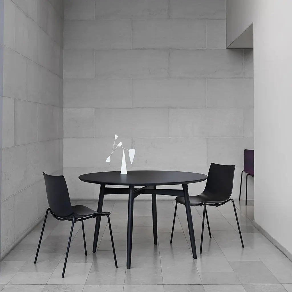 The BA103 Preludia Round Table by Brad Ascalon displays many considered details and a bold design that suits smaller spaces. The table is part of the Preludia Series that includes various size tables and chair options. The tabletop is available in laminate, while the frame comes in solid wood with various finishes.