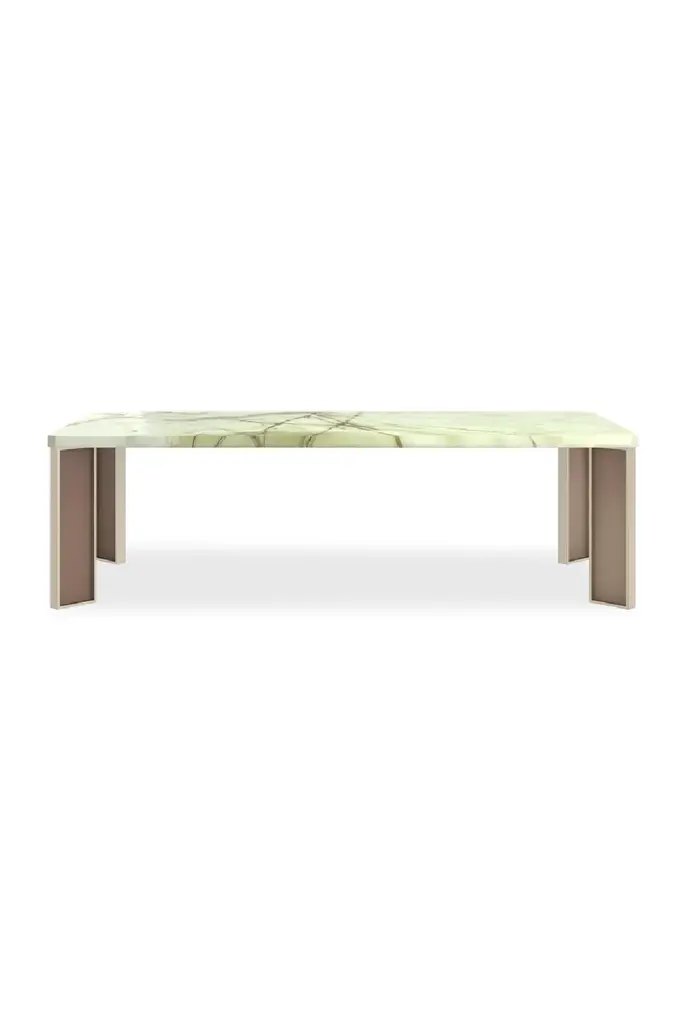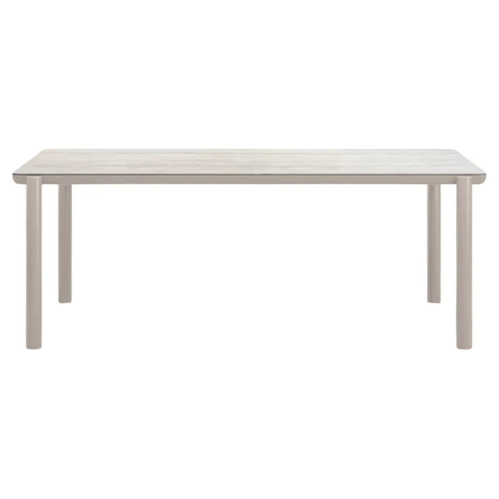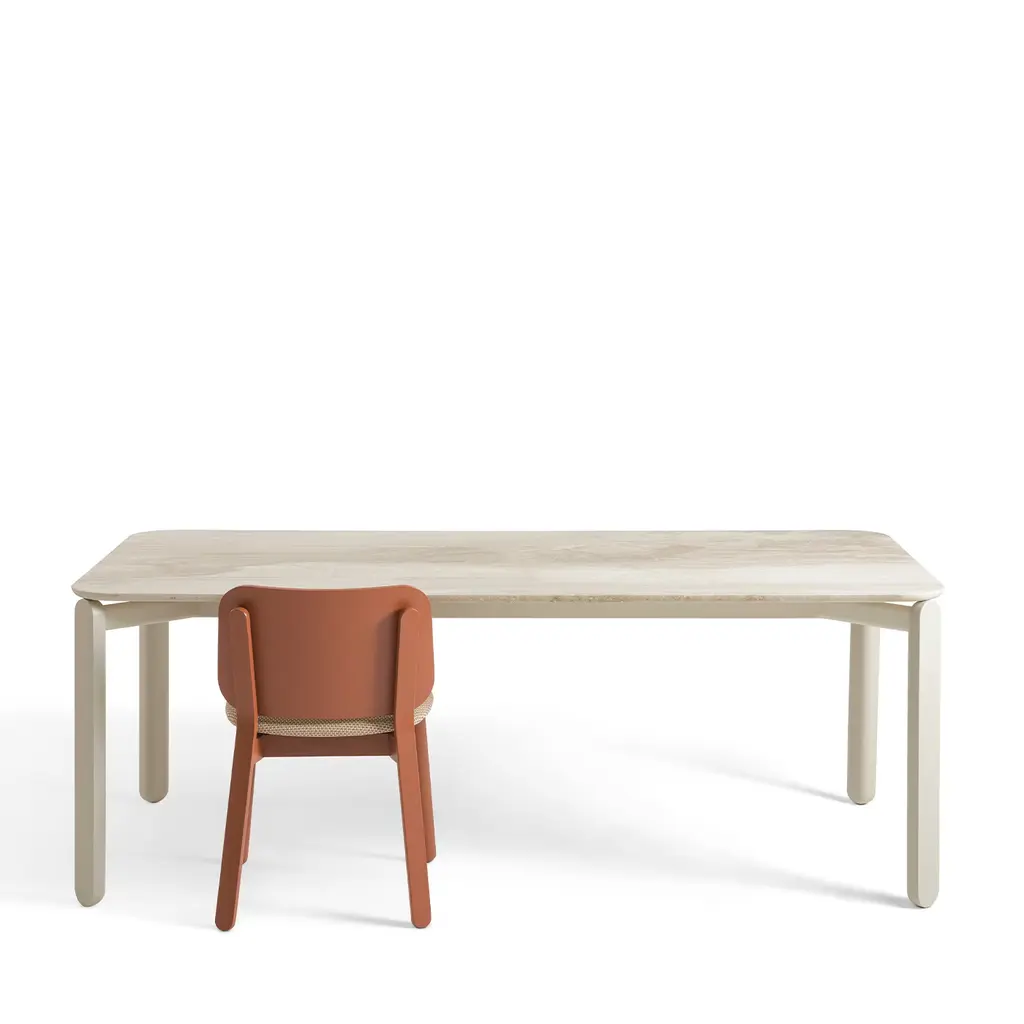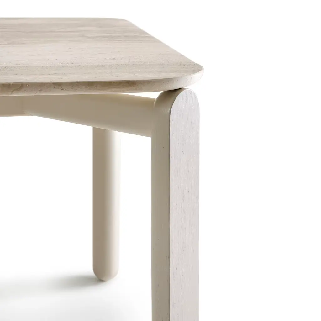The Babà 878 dining table designed by Emilio Nanni features a softly rounded, curvilinear shape that blends contemporary design with Mediterranean influences. It has a beige Daino Reale marble top supported by a painted metal structure and ash wood legs with a smooth finish, showcasing refined craftsmanship and elegant materials.