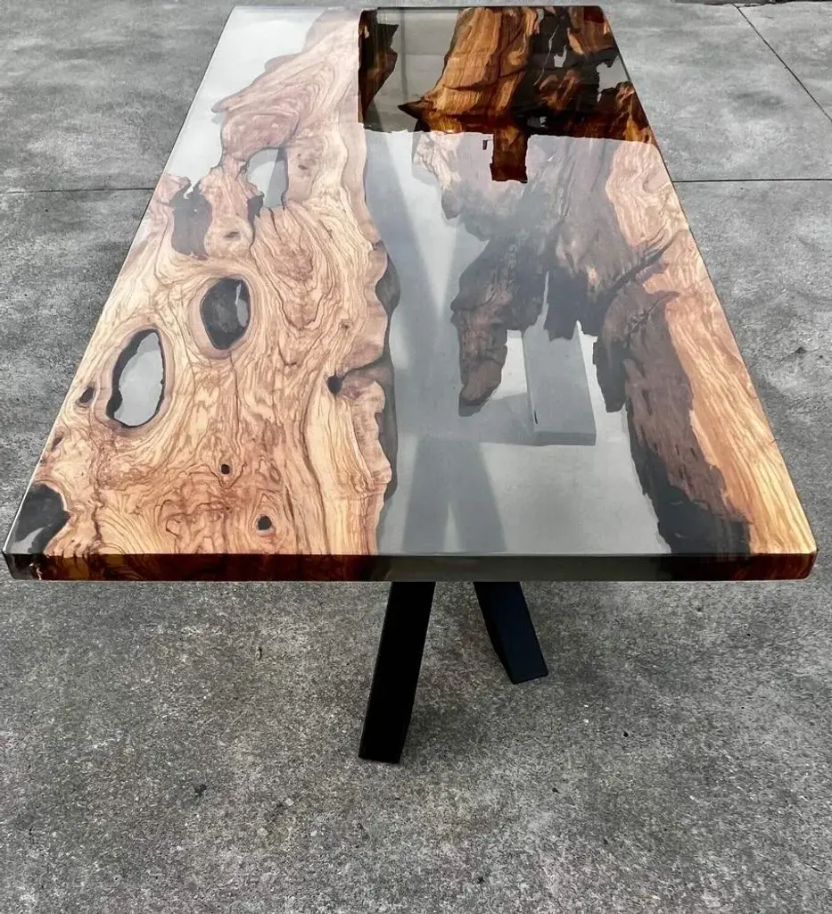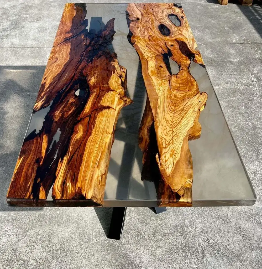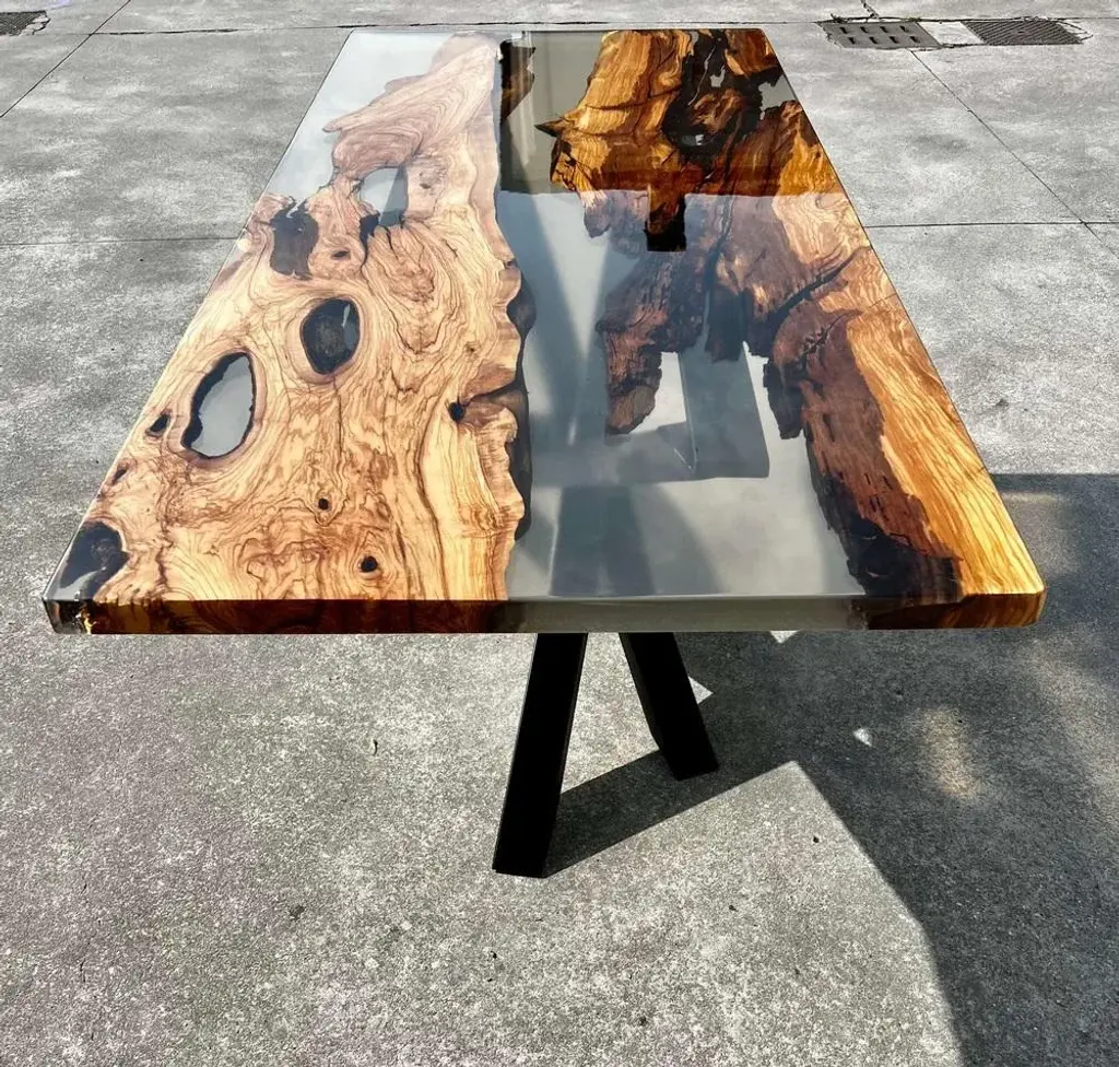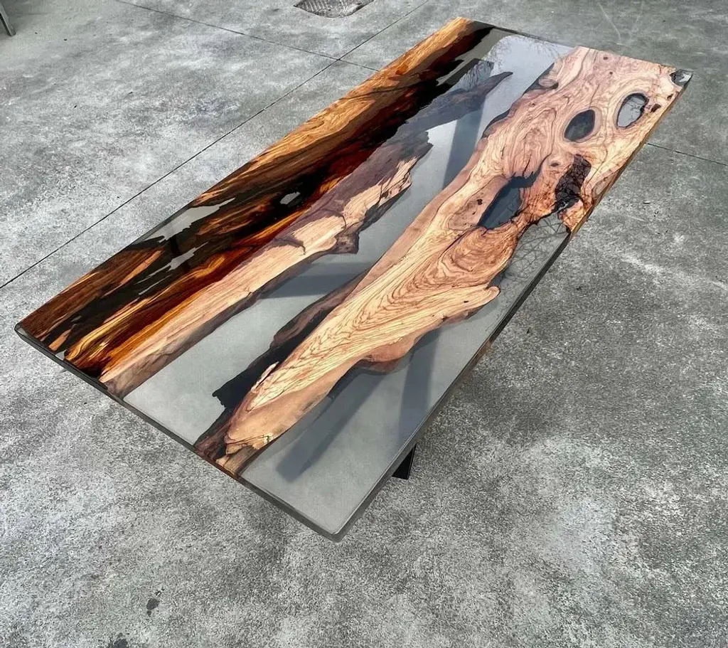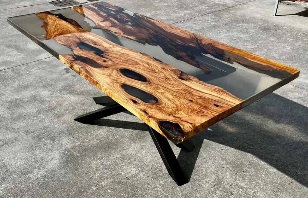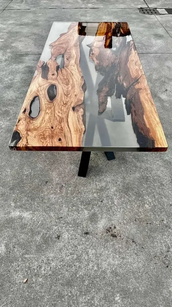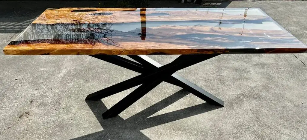Babylon is a dining table made of wood and epoxy resin. in this river table two steps of lecce olive and epoxy resin are used. the top table is transparent shiny lacquered with hand -polished polyester to obtain the maximum in terms of lucing surface. the spyder spyder wap model matchers are opaque black lacquered. each table of mine is made exclusively by hand, in italy, on commission and tailored to the customer. the proposed images concern a table already made. in case of order, a news table will be created on the basis of the babylon model. Signed by maker