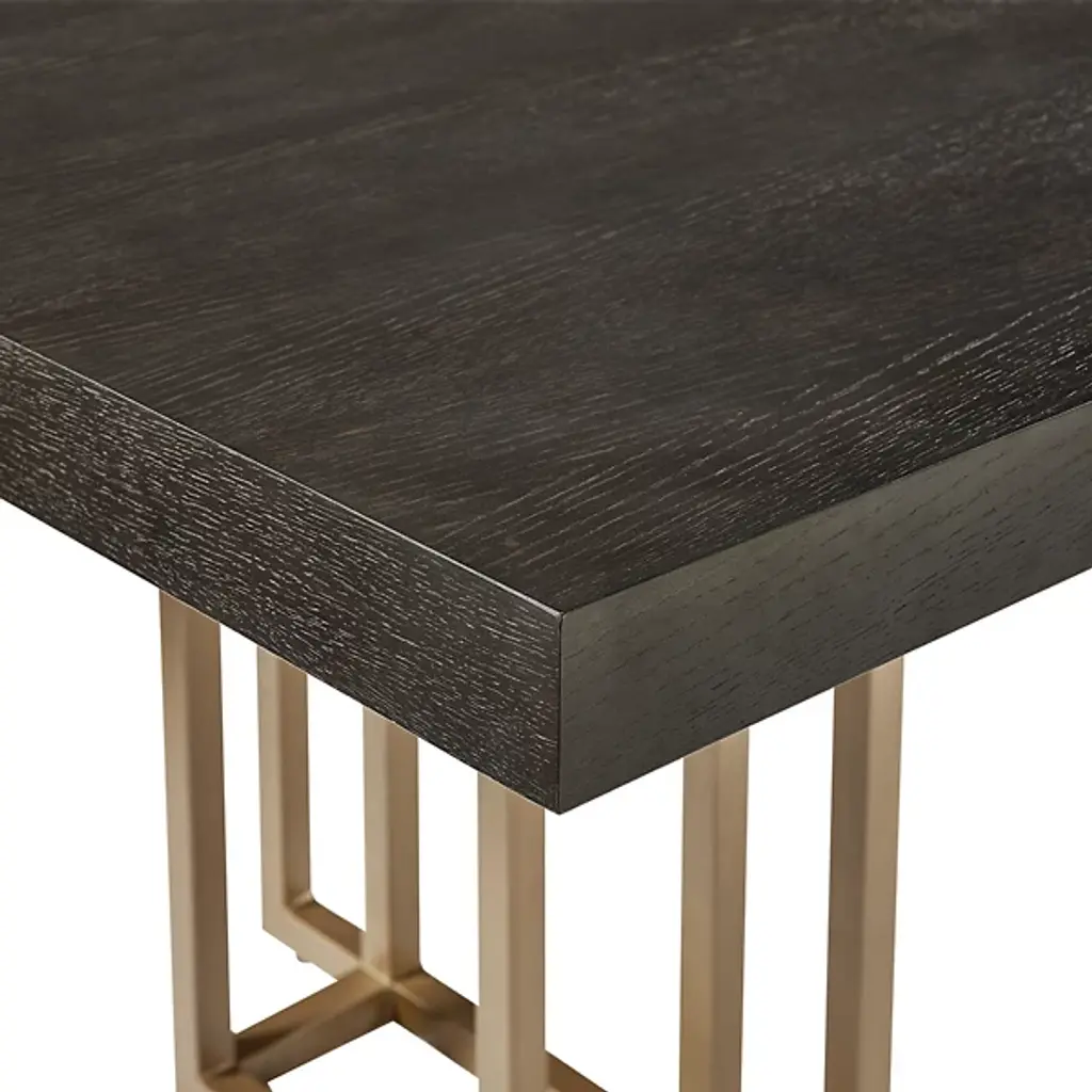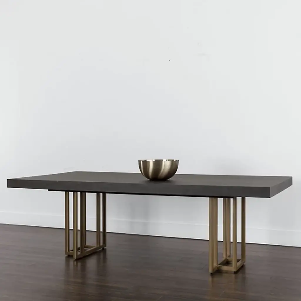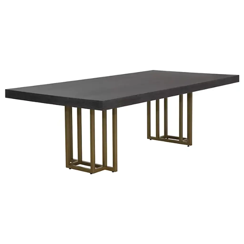 The Baladessara Dining Table from Sunpan combines classic design with a modern twist. Featuring a sleek oak veneer tabletop complemented by bold powder-coated steel legs in a rustic finish, creating a memorable focal point in any dining space. The natural wood grain across the top of the table features unique variations in texture, ensuring that each table is unique, adds character and warmth to its surroundings, and presents a timeless style with a contemporary edge.