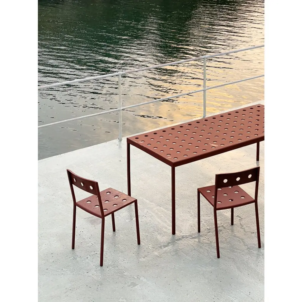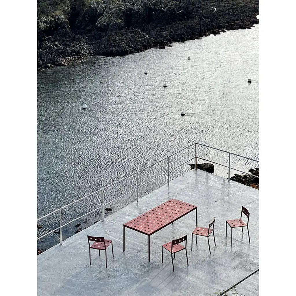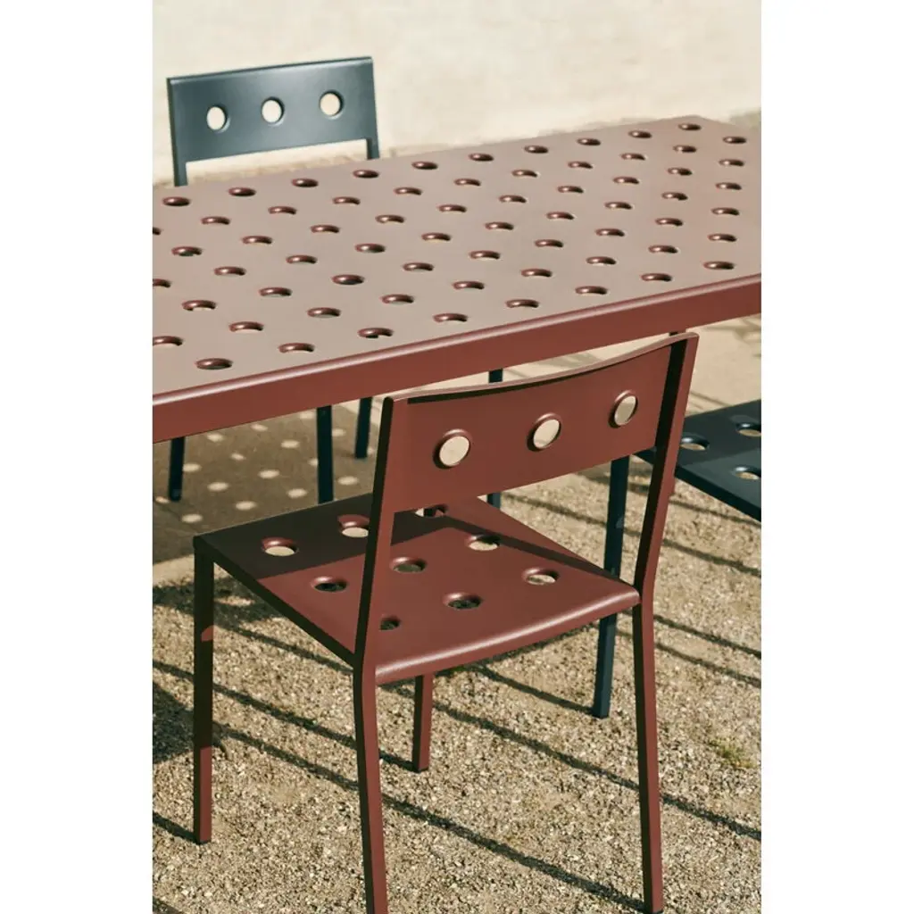 HAY’s Balcony table is part of a clever collection of outdoor furniture designed by the Bouroullec brothers. Made of thin steel sheet, the elegant Balcony outdoor dining tables are incomparably light and easy to move – a perfect addition to the garden or a patio. Featuring a weather-resistant coating the Balcony collection is as carefree as it looks. The round holes pressed through the steel plate provide multiple functions: they add character and softness to the geometrical design and allow rainwater to drain off the table's surface, while also strengthening the structure of the furniture.