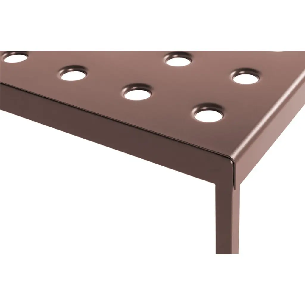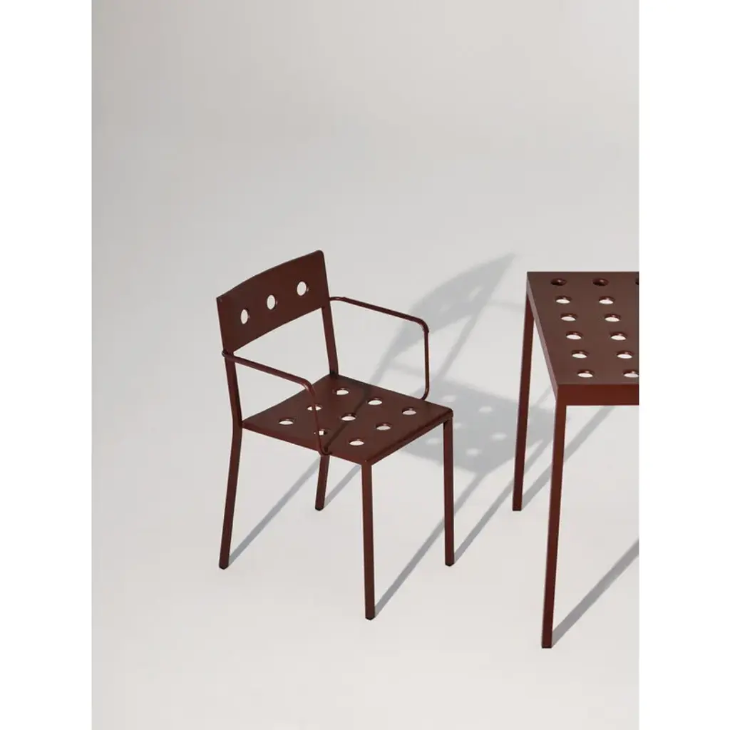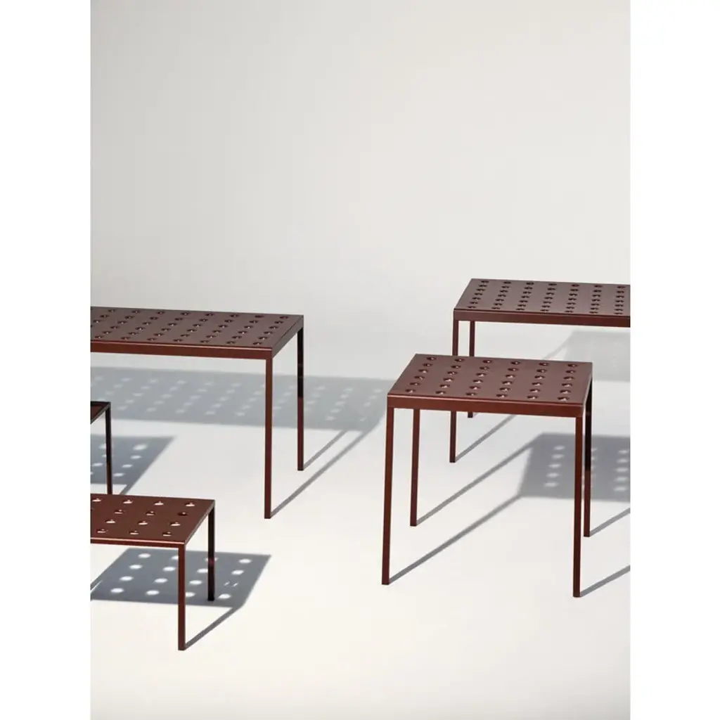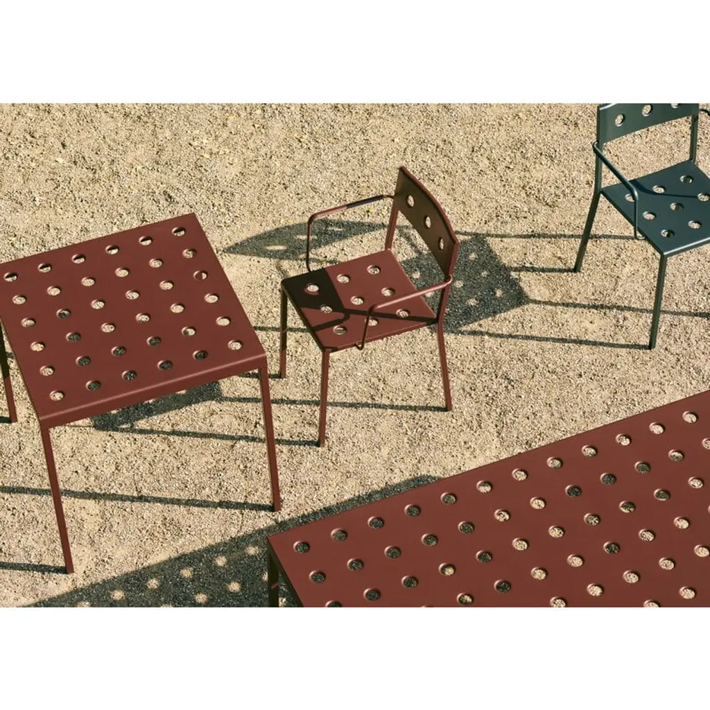 HAY’s Balcony table is part of a clever collection of outdoor furniture designed by the Bouroullec brothers. Made of thin steel sheet, the elegant Balcony outdoor dining tables are incomparably light and easy to move – a perfect addition to the garden or a patio. Featuring a weather-resistant coating the Balcony collection is as carefree as it looks. The round holes pressed through the steel plate provide multiple functions: they add character and softness to the geometrical design and allow rainwater to drain off the table's surface, while also strengthening the structure of the furniture.