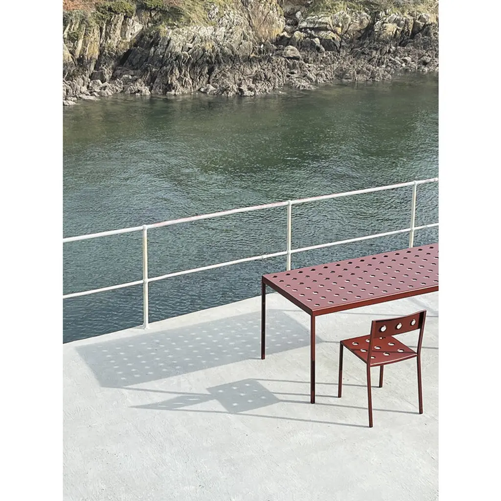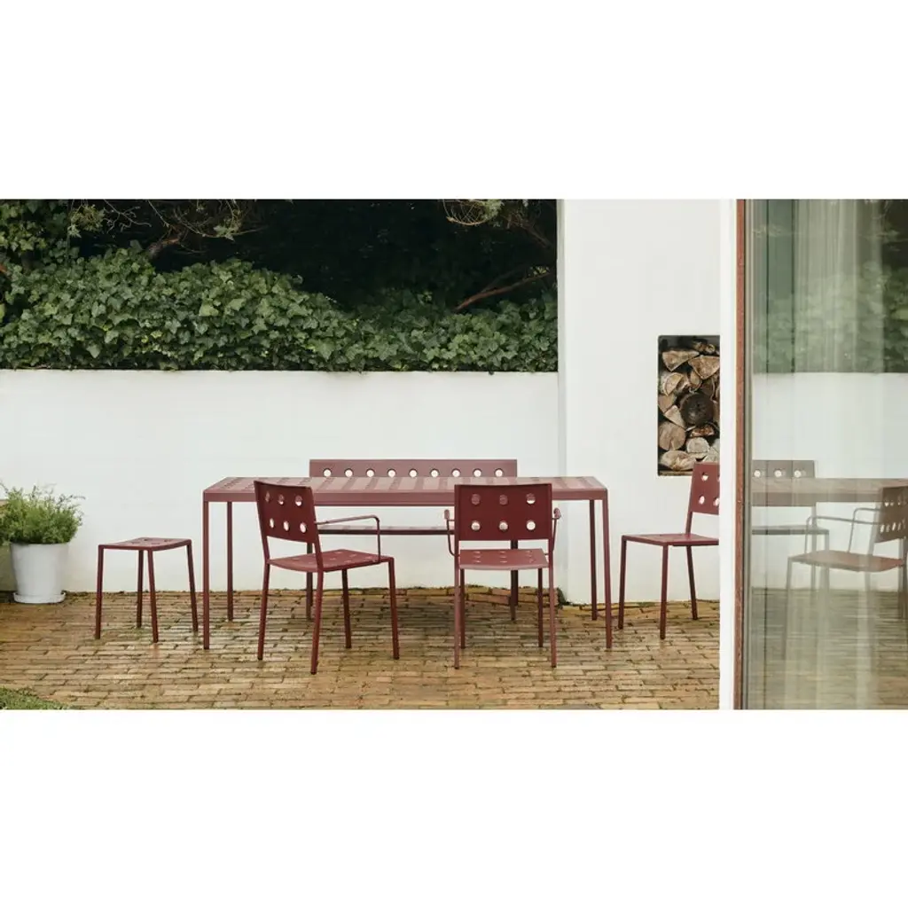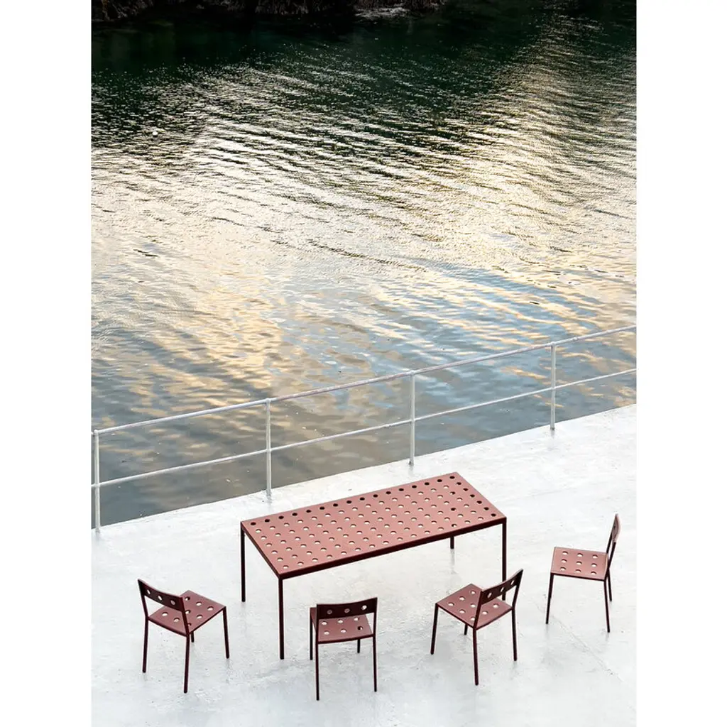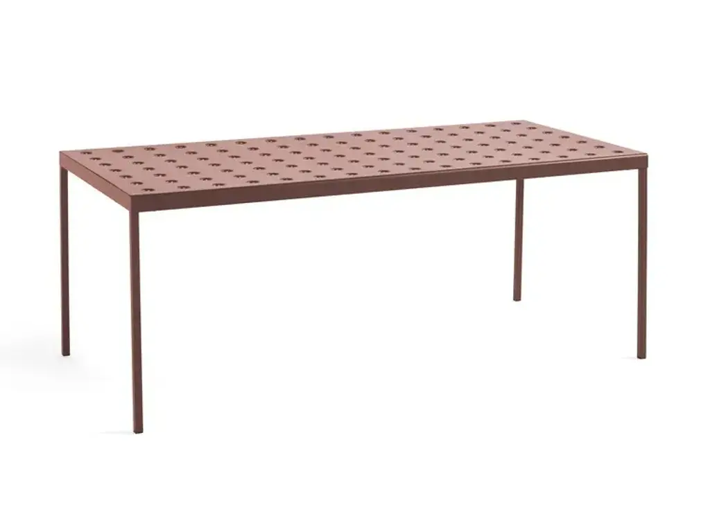 HAY’s Balcony table is part of a clever collection of outdoor furniture designed by the Bouroullec brothers. Made of thin steel sheet, the elegant Balcony outdoor dining tables are incomparably light and easy to move – a perfect addition to the garden or a patio. Featuring a weather-resistant coating the Balcony collection is as carefree as it looks. The round holes pressed through the steel plate provide multiple functions: they add character and softness to the geometrical design and allow rainwater to drain off the table's surface, while also strengthening the structure of the furniture.