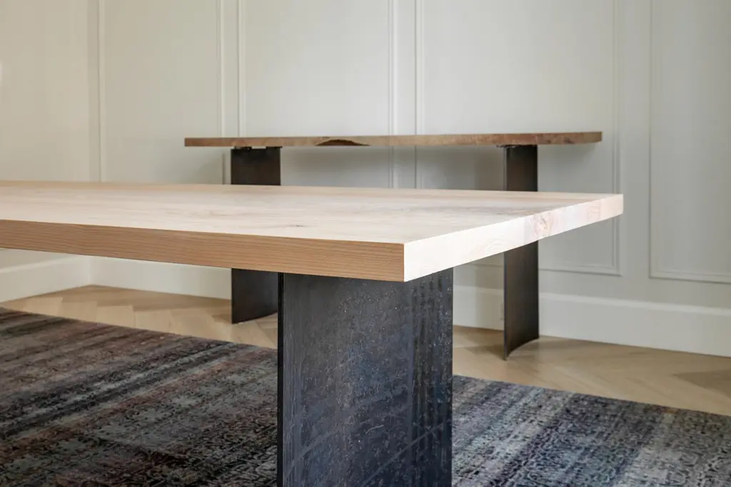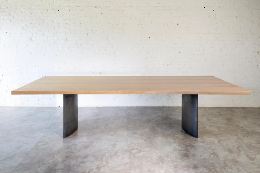 The Ban table in White Oak by Autonomous Furniture - where contemporary design meets natural beauty. Crafted with precision and passion, this exquisite dining table effortlessly blends Scandinavian influences with modern sophistication. Crafted from White Oak, each piece is hand-finished with an all-natural hard wax oil for a touch of timeless elegance.The Ban table's exceptional design does not compromise on functionality. Supported by sturdy 3/8" curved hot rolled steel legs, this table is as visually striking as it is durable. The combination of the steel legs and the elevated wood surface creates a harmonious balance, making it the perfect centerpiece for any contemporary dining room.Designed by Kirk Van Ludwig, award-winning Designer of the Year finalist for Western Living magazine, this table reflects his unrivaled expertise in creating modern furniture. With its minimalist lines and use of mixed materials, the Ban table showcases Van Ludwig's commitment to pushing boundaries and challenging the norms of modern design.Available in tailored sizes, the Ban table can be customized to fit seamlessly into your space. Additionally, it comes in a range of other exquisite wood options such as Black Walnut, Whitened Ash, and Torched Oak, ensuring there's a perfect match for every taste.Bring the spirit of Autonomous Furniture into your home with the Ban table. Exquisite craftsmanship, sustainable sourcing, and a commitment to lasting quality - all come together to create a truly exceptional piece of furniture. Elevate your dining experience and make a statement with this contemporary masterpiece.Specifications:96" L x 44" W x 29" H. Tailored sizing available.Solid White Oak with oil and wax finish. Available in Black Walnut, Whitened Ash, and Torched Oak.