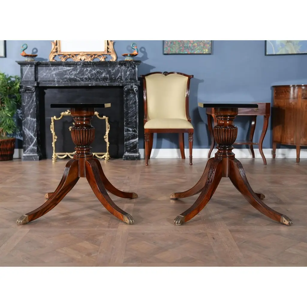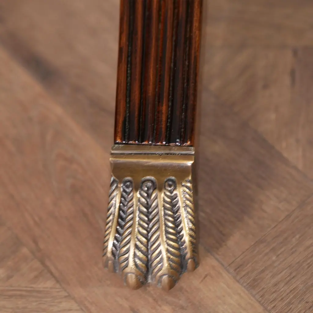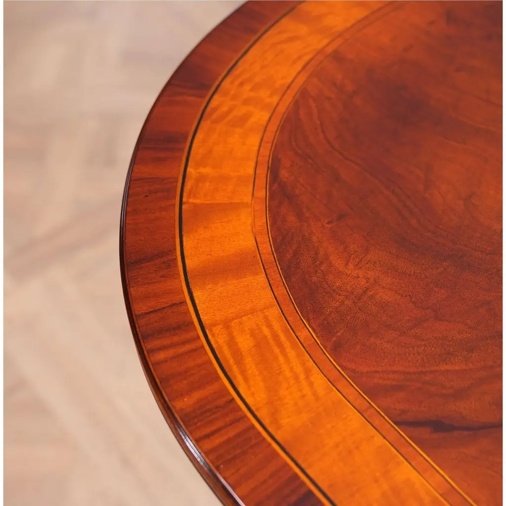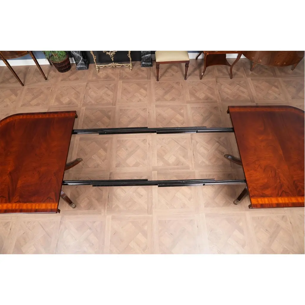The Banded Mahogany Dining Table has a lot of great features that combine to make it a show stopper. A reeded solid mahogany edge surrounds the table top and then flows into numerous bandings consisting of rosewood, satinwood, ebony and sapele before reaching the field of the table top which is comprised of high quality mahogany figural veneers. Below the table top the generous apron gives the table top depth as well as serving to help hide the American made metal table rails below. Closing to 79 inches the Banded Mahogany Dining Table extends with the three leaves in place to a length of 138 inches making it versatile and suitable for even large gatherings of up to twelve people.Stock Photo for reference only. We take every measure to ensure that all of our dining tables are created to the highest standard using materials of similar quality but each table will appear slightly different due to the use of naturally occurring materials such as wood in the creation of our products.Measures 48″W x 79″L – 138″L x 31″H metric: 122 x 200-350 x 79