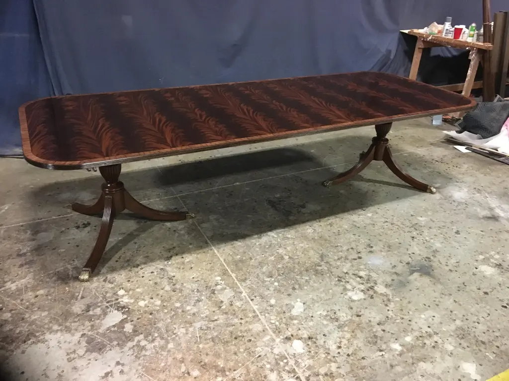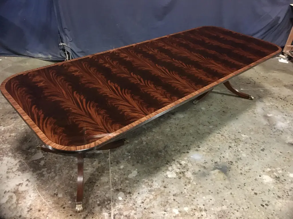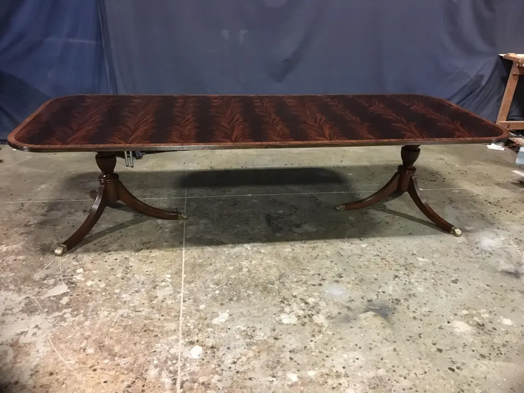 This is a made to order traditional mahogany dining table made in the Leighton Hall shop in Suwanee, Georgia. It features a field of slip-matched swirly crotch mahogany from West Africa. It has a satinwood border and a three beaded edge. It has a hand rubbed and polished semigloss finish. The Sheraton style pedestals have three fluted legs which terminate with antique brass lions paw feet. Dimensions: 46 in. x 74 in. with two 22 in. leaves (total length with leaves inserted is 118 in..) Estimated production time is 10-12 weeks. Please note this estimated production time could vary.