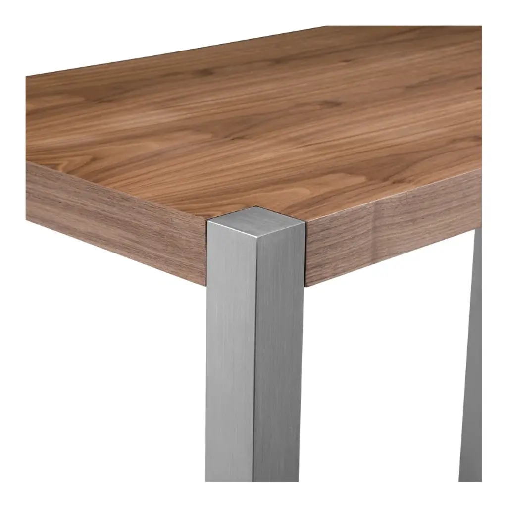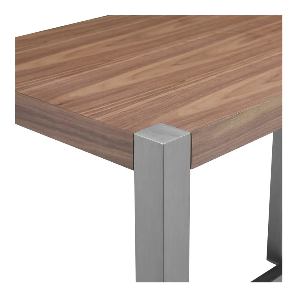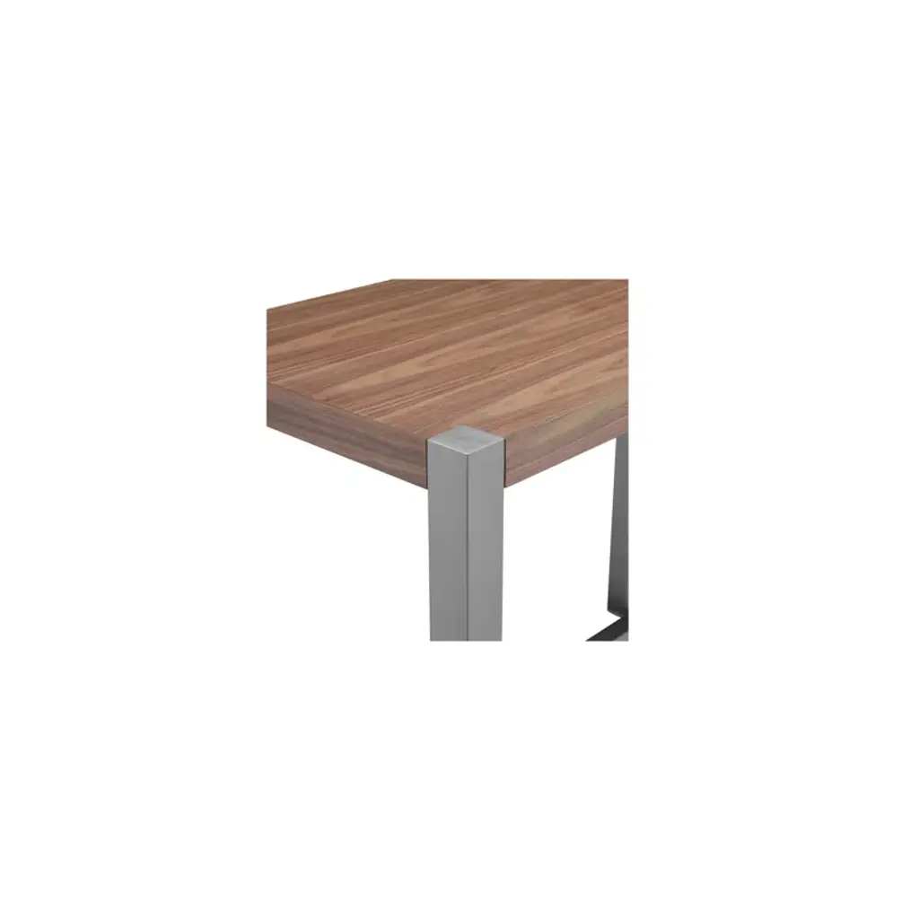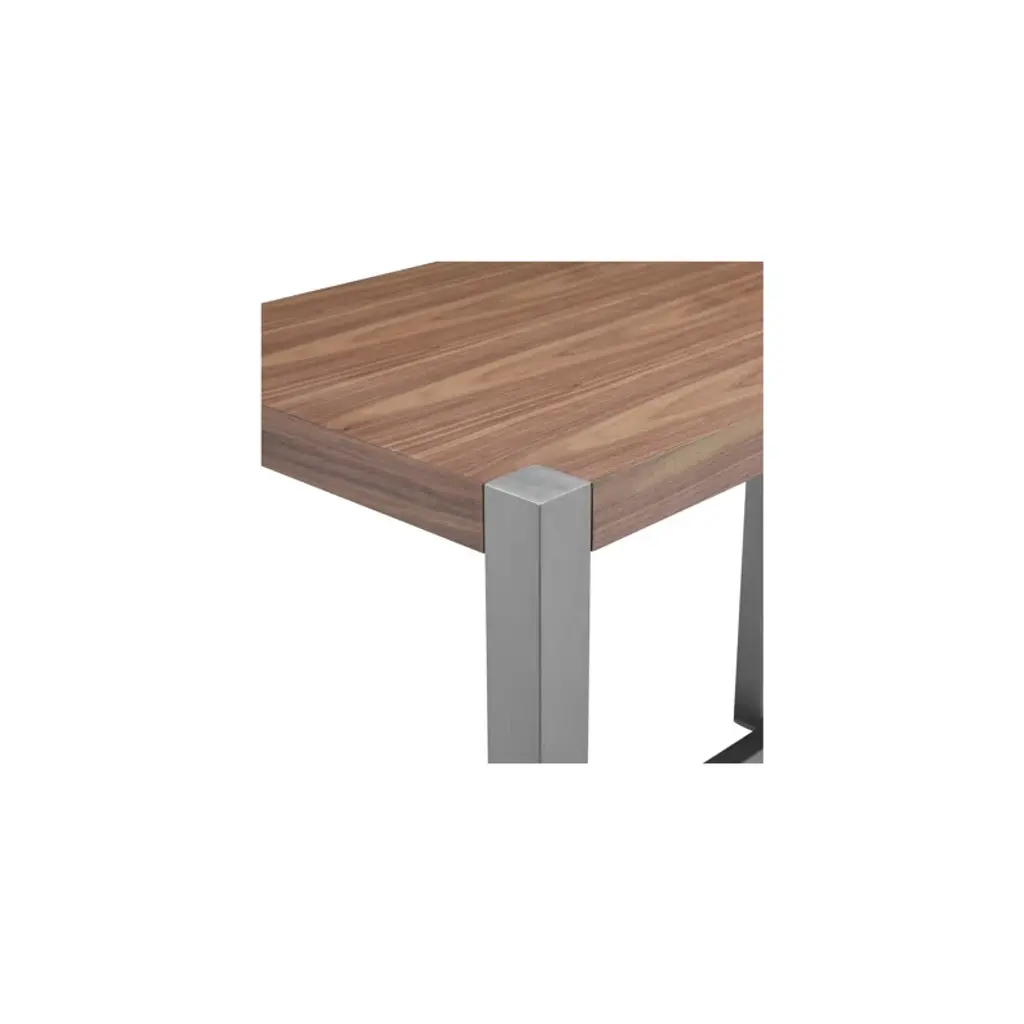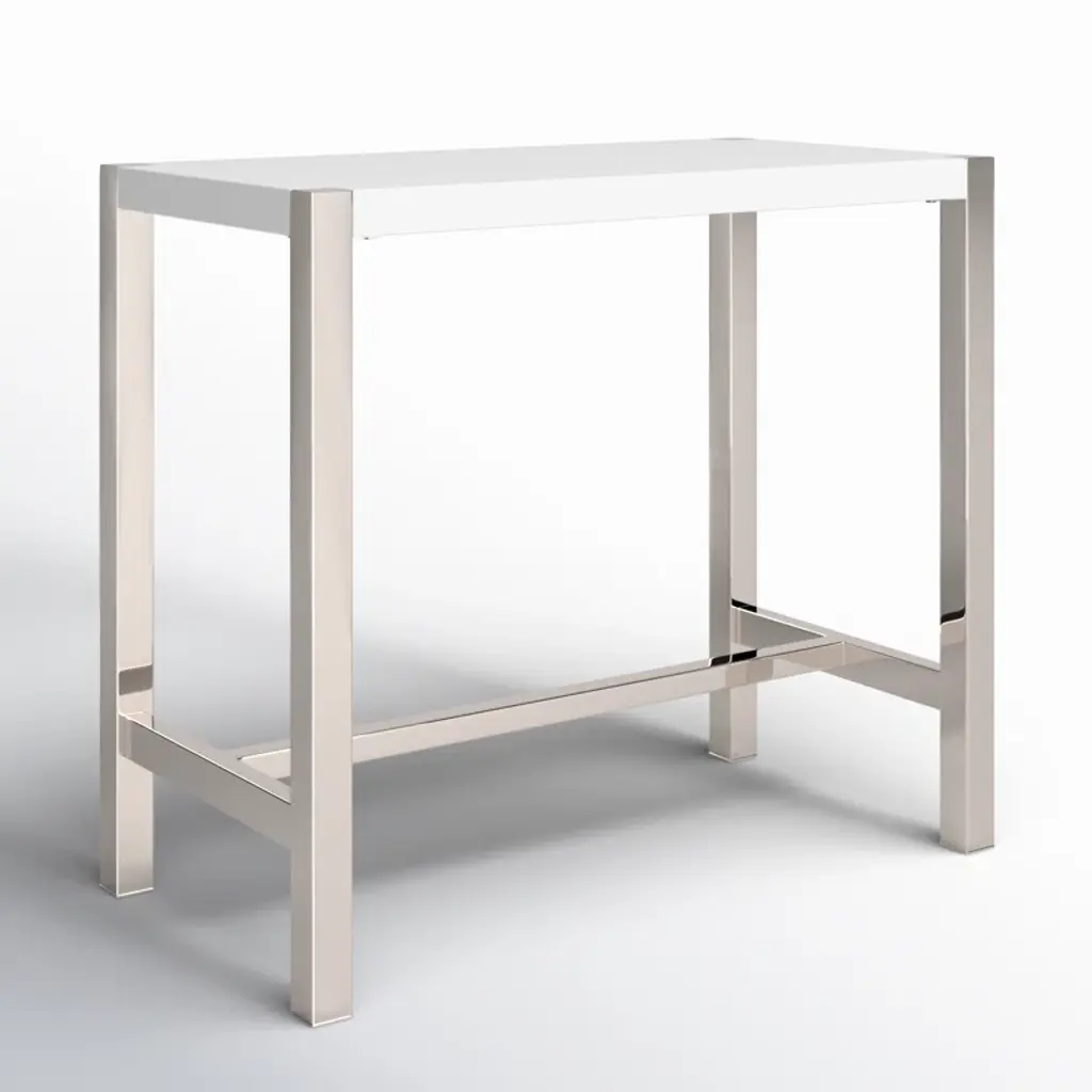 This dining table is your new centerpiece for cozy dinners and lively gatherings. With its rectangular shape and a blend of warm brown and crisp white, it effortlessly complements your dining room decor. The table features an engineered wood top with a natural wood grain finsh, adding a hint of nature's charm to your space. Supported by a sleek stainless steel trestle base, this table seats four comfortably, making it a great choice for intimate meals or game nights. Its glossy finish adds a modern touch, while the sturdy construction promises stability. Pair it with your favorite chairs and let the dining adventures begin!