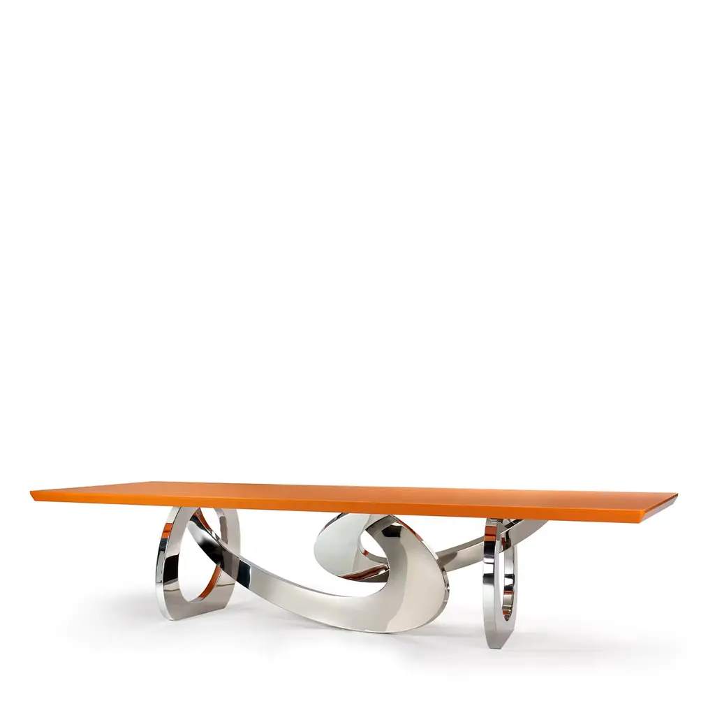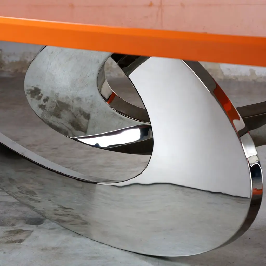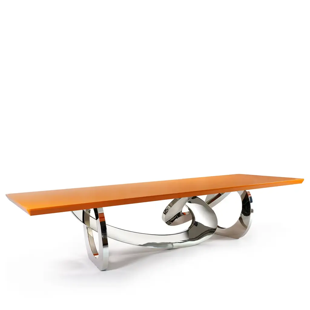 This sculptural table is the original that was used in two scenes of the film House Of Gucci. It was chosen by Ridley Scott who personally expressed the desire to lacquer the tabletop in glossy Gucci orange. The table was handmade in mirror-polished stainless steel and has the following dimensions: 350 x 120 cm. The bottom of the tabletop is signed with a work title by the film team. Bangles ‘House of Gucci’ is a unique piece.