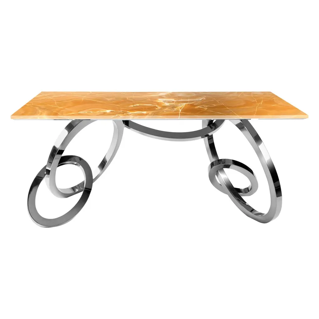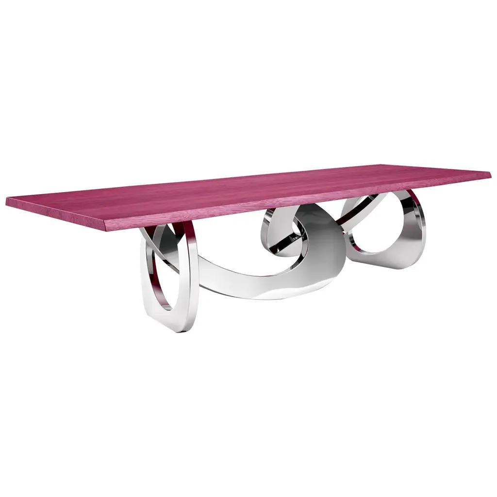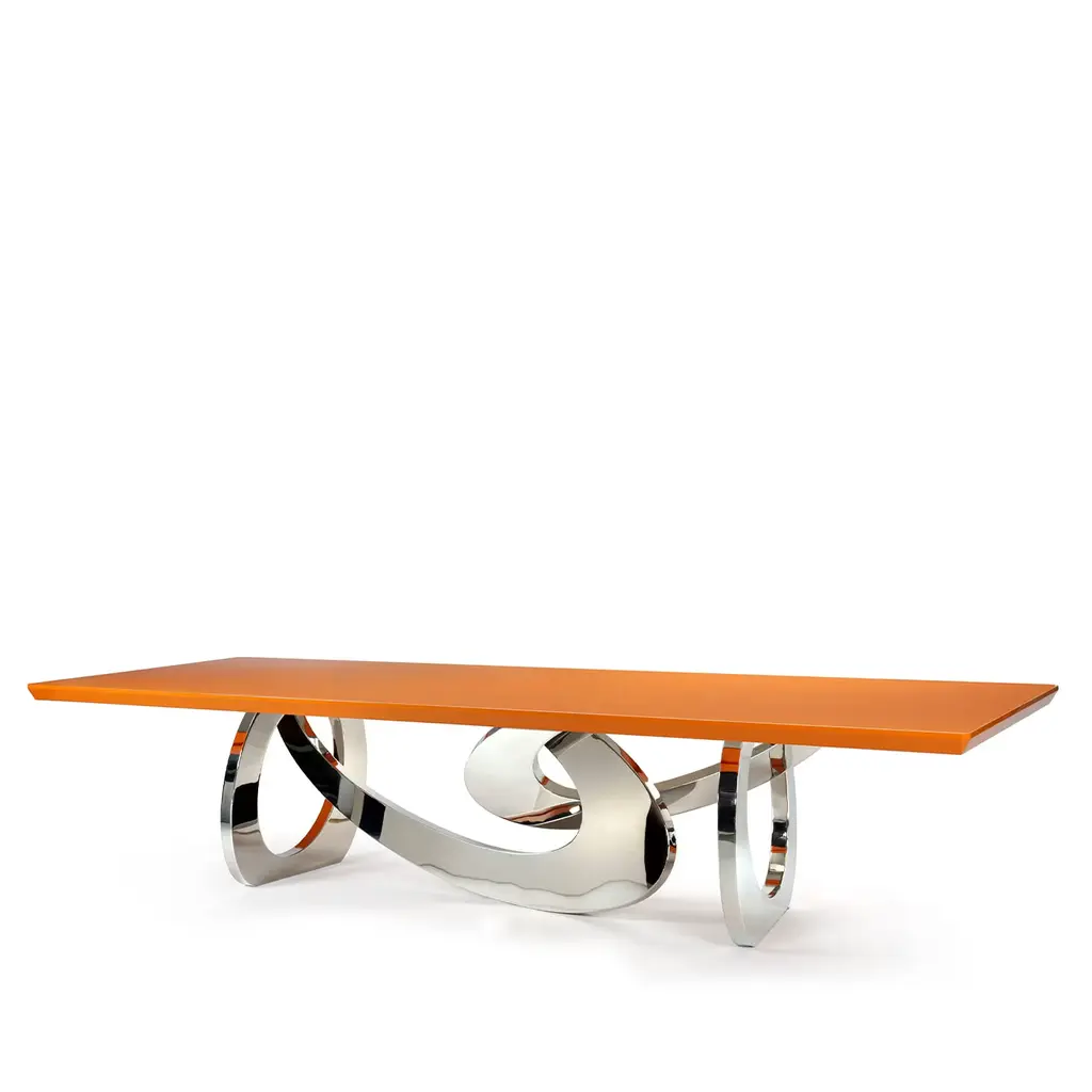 This sculptural table is the original that was used in two scenes of the film House Of Gucci. It was chosen by Ridley Scott who personally expressed the desire to lacquer the tabletop in glossy Gucci orange. The table was handmade in mirror-polished stainless steel and has the following dimensions: 350 x 120 cm. The bottom of the tabletop is signed with a work title by the film team. Bangles ‘House of Gucci’ is a unique piece.