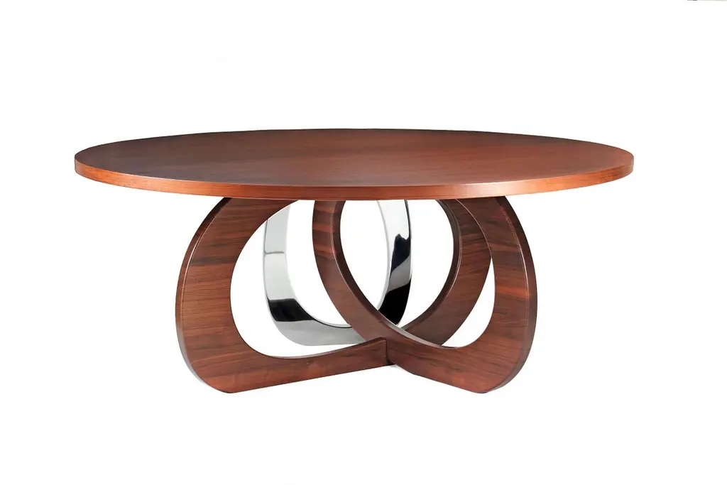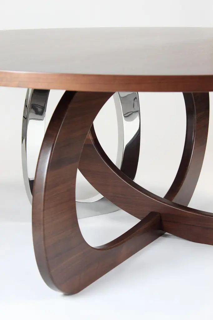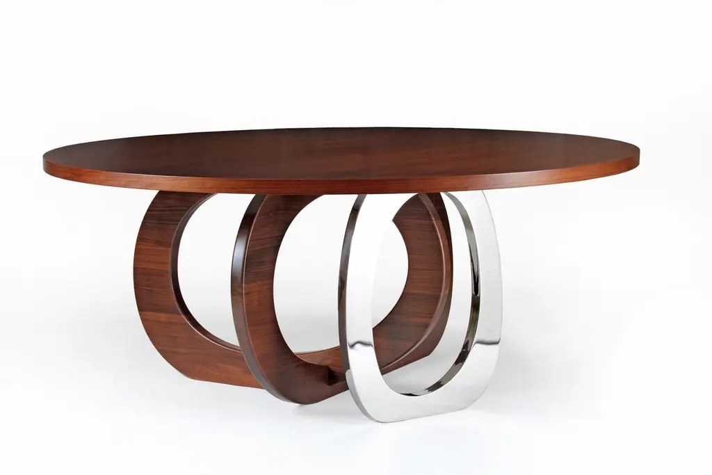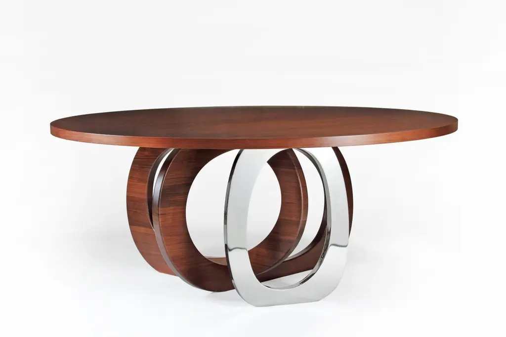 Bangles Kelowna Dining Table by Barberini & GunnellDimensions: D 180 x H 75 cm.Materials: Solid American walnut, mirror-polished stainless steel.Round table with two rings in solid wood and a single ring in mirror-polished stainless steel AISI 316.The table is customizable in size and different wood essences.Barberini & Gunnell, founded in 2009 in Ancona, Italy by architects Francesco Barberini and Nina A. Gunnell, is the result of a philosophy, thinking of design and architecture as a work of art. The architectural and interior design activity carried out by ‘The Studio’ complements the creations of ‘The Atelier’, which are the result of an artistic playground and highly skilled craftsmanship, a place where artworks and sculptures come to life.The Studio Barberini & Gunnell designs high-end residential and retail spaces that are out of the ordinary and beyond fashion. Barberini & Gunnell creates refined, timeless, and harmonious environments by inserting collectible design, “talking pieces” that create unique and bespoke homes according to the client’s eclectic and aesthetic desires.The Atelier Barberini & Gunnell creates artworks and collectible designs, one-off pieces, and limited editions for a small niche of high-end projects; bespoke solutions for luxury and ultra-luxury projects all over the world.The choice of the most precious materials, the maniacal cure for detail is the basis of our modus operandi aiming to create timeless pieces, using marine grade stainless steel, brass, cast bronze, precious wood essences, marbles, onyxes, semi-precious gemstones, crystal glass, together with the most sophisticated technologies and quality craftsmanship.This allows us to work for clients like Four Seasons Hotels, The Ritz Carlton, Regent Seven Seas Cruises, Louis Vuitton, Cartier, Dior, Paramount Pictures, Peter Marino Architects, Sotheby’s, Bonhams, Foundation of Maestro Andrea Bocelli, Ridley Scott (House of Gucci) besides our private collectors and clients.Values such as sustainability, the use of natural materials, the rediscovery of eco-sustainable craftsmanship, and the protection of refined and ancient techniques that are increasingly being lost are the basis of the design.Barberini & Gunnell’s signature works are exhibited at international art fairs such as Art Basel Design//Miami, Art Miami, Art Basel Switzerland, PAD London, PAD Genève, PAD Paris, PAD Monaco, Salon Art+Design New York…