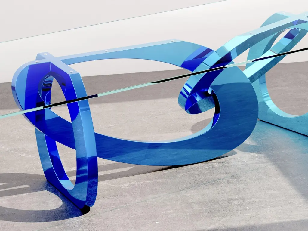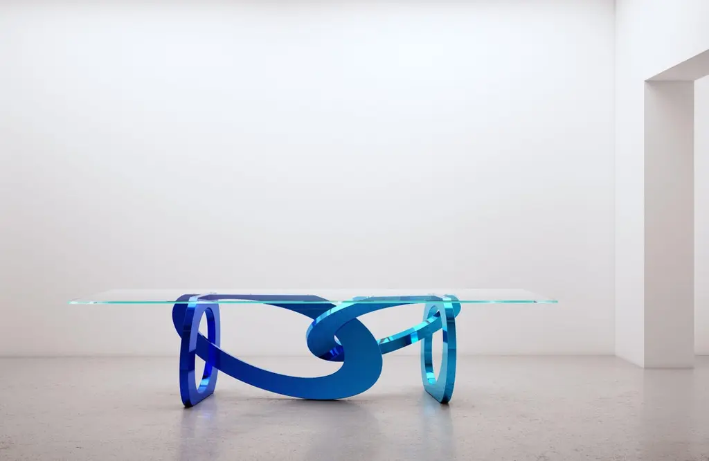Bangles Pop Dining Table by Barberini & GunnellLimited Edition of 15Dimensions: D 120 x W 350 x H 76 cm.Materials: Tempered crystal glass, mirror polished stainless steel colored.Limited Edition, signed and numbered by the artists, comes with a Certificate of Authenticity.Barberini & Gunnell, founded in 2009 in Ancona, Italy by architects Francesco Barberini and Nina A. Gunnell, is the result of a philosophy, thinking of design and architecture as a work of art. The architectural and interior design activity carried out by ‘The Studio’ complements the creations of ‘The Atelier’, which are the result of an artistic playground and highly skilled craftsmanship, a place where artworks and sculptures come to life.The Studio Barberini & Gunnell designs high-end residential and retail spaces that are out of the ordinary and beyond fashion. Barberini & Gunnell creates refined, timeless, and harmonious environments by inserting collectible design, “talking pieces” that create unique and bespoke homes according to the client’s eclectic and aesthetic desires.The Atelier Barberini & Gunnell creates artworks and collectible designs, one-off pieces, and limited editions for a small niche of high-end projects; bespoke solutions for luxury and ultra-luxury projects all over the world.The choice of the most precious materials, the maniacal cure for detail is the basis of our modus operandi aiming to create timeless pieces, using marine grade stainless steel, brass, cast bronze, precious wood essences, marbles, onyxes, semi-precious gemstones, crystal glass, together with the most sophisticated technologies and quality craftsmanship.This allows us to work for clients like Four Seasons Hotels, The Ritz Carlton, Regent Seven Seas Cruises, Louis Vuitton, Cartier, Dior, Paramount Pictures, Peter Marino Architects, Sotheby’s, Bonhams, Foundation of Maestro Andrea Bocelli, Ridley Scott (House of Gucci) besides our private collectors and clients.Values such as sustainability, the use of natural materials, the rediscovery of eco-sustainable craftsmanship, and the protection of refined and ancient techniques that are increasingly being lost are the basis of the design.Barberini & Gunnell’s signature works are exhibited at international art fairs such as Art Basel Design//Miami, Art Miami, Art Basel Switzerland, PAD London, PAD Genève, PAD Paris, PAD Monaco, Salon Art+Design New York…