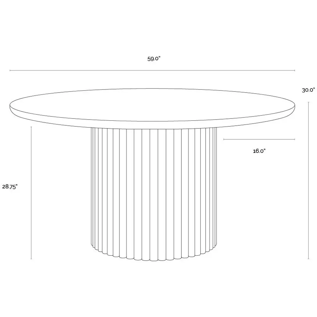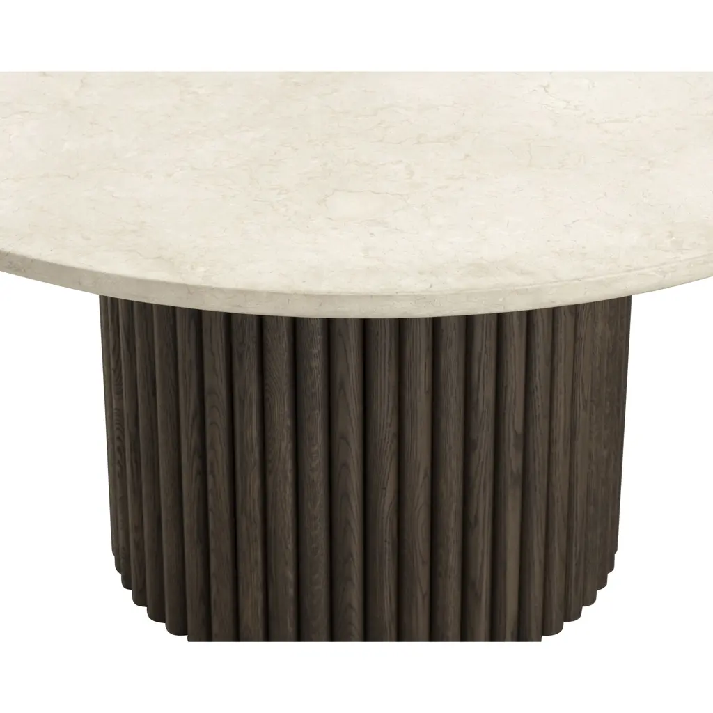 The Banyan Dining Table is a standout with rounded curves and sculpted edges. Crafted to perfection with a cream marble top and a fluted solid oak wood base, this dining table is a modern masterpiece.