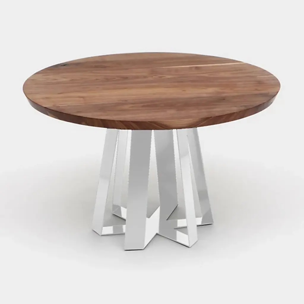 496082-65L-WBA The top of the dining table features American walnut veneers with a transparent, low luster lacquer. Base is fabricated from steel and finished in a light, champagne patina.