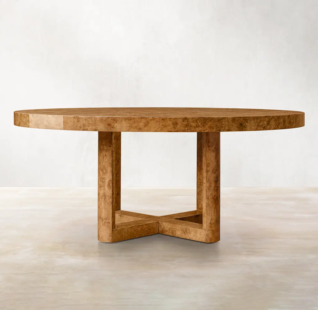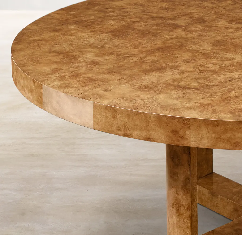 Understated and tailored in its restraint, our collection honors the minimalist geometric forms of 1970s postmodernism and the era's embrace of exotic materials. The clean, gently curved silhouettes are wrapped in burl wood veneers, which highlight the intricate, swirling grain patterns and mottled shading. Expertly cut and pieced by hand, the burl is sanded and buffed to an elegant sheen. SHOP THE ENTIRE COLLECTION