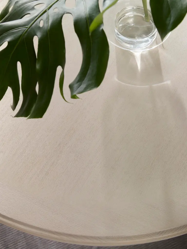 The Bardot Dining Table features a 60 oak round top with a veneered edge pattern and a multi-stepped beveled edge detail. A large cylindrical base culminates in a two tiered round pedestal. A design that feels both modern and relaxed Bardot is wrapped in a light finished casual oak veneer. Assembly Required? No Care Instructions: Dust with a soft, clean cloth slightly moistened with water, and dry completely with another clean cloth, always rubbing with the grain.