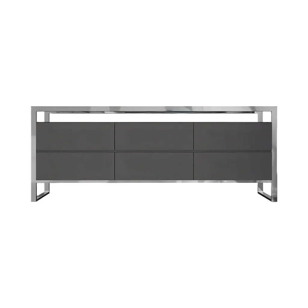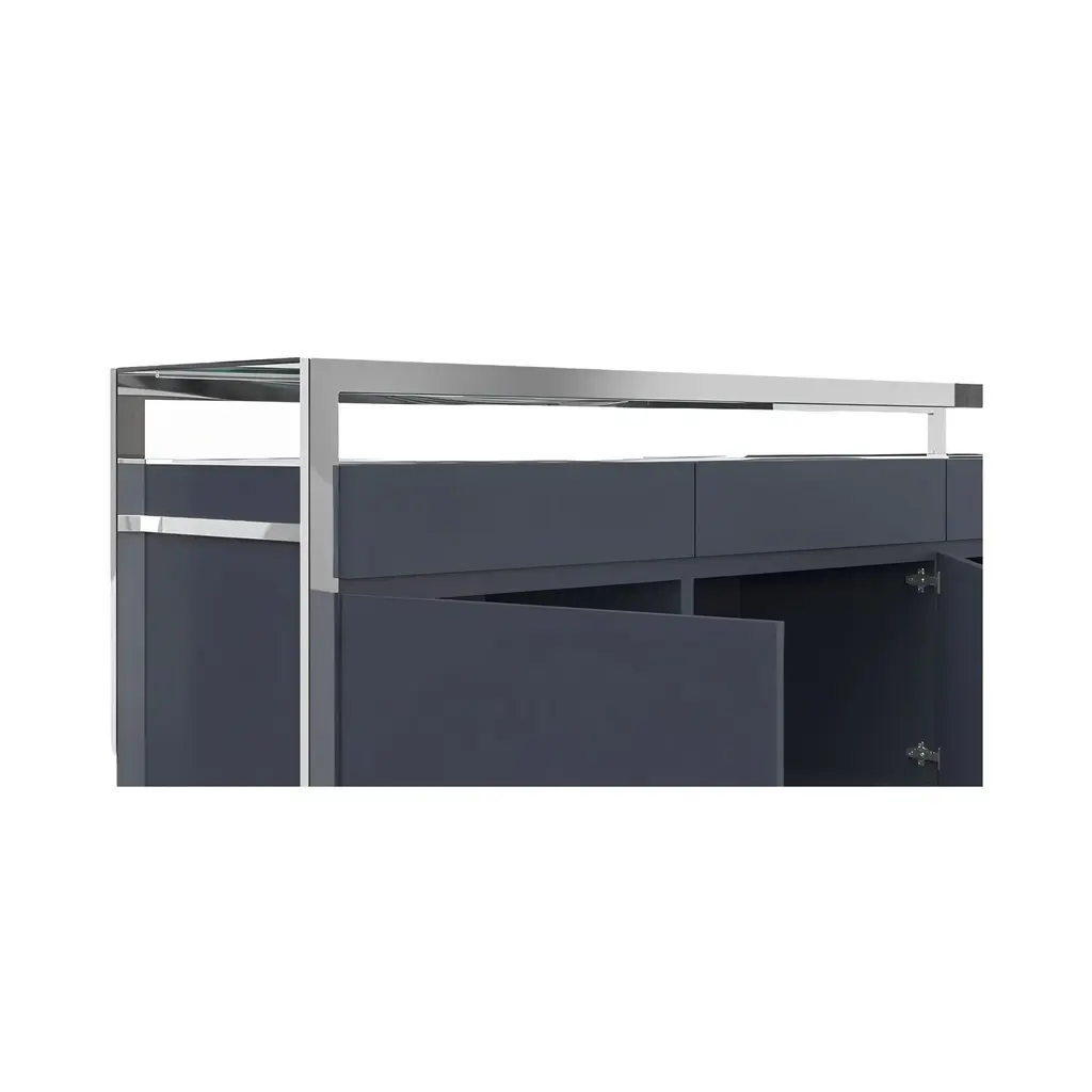 This French-inspired Bari Buffet in Gray will look great in any space with its ample storage areas and sleek features. A stainless-steel frame supports the buffet table for a one of a kind look that is sure to turn heads. Artfully mastering contemporary styling, this buffet table incorporates a minimalistic yet beautiful composition perfect for any modern room. Enjoy the clean look of your dining room while pairing this with stainless steel accents and shiny décor. Local Delivery Only.