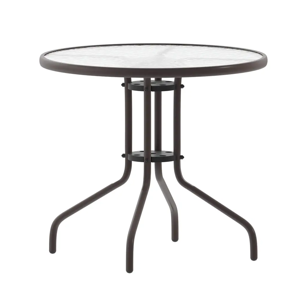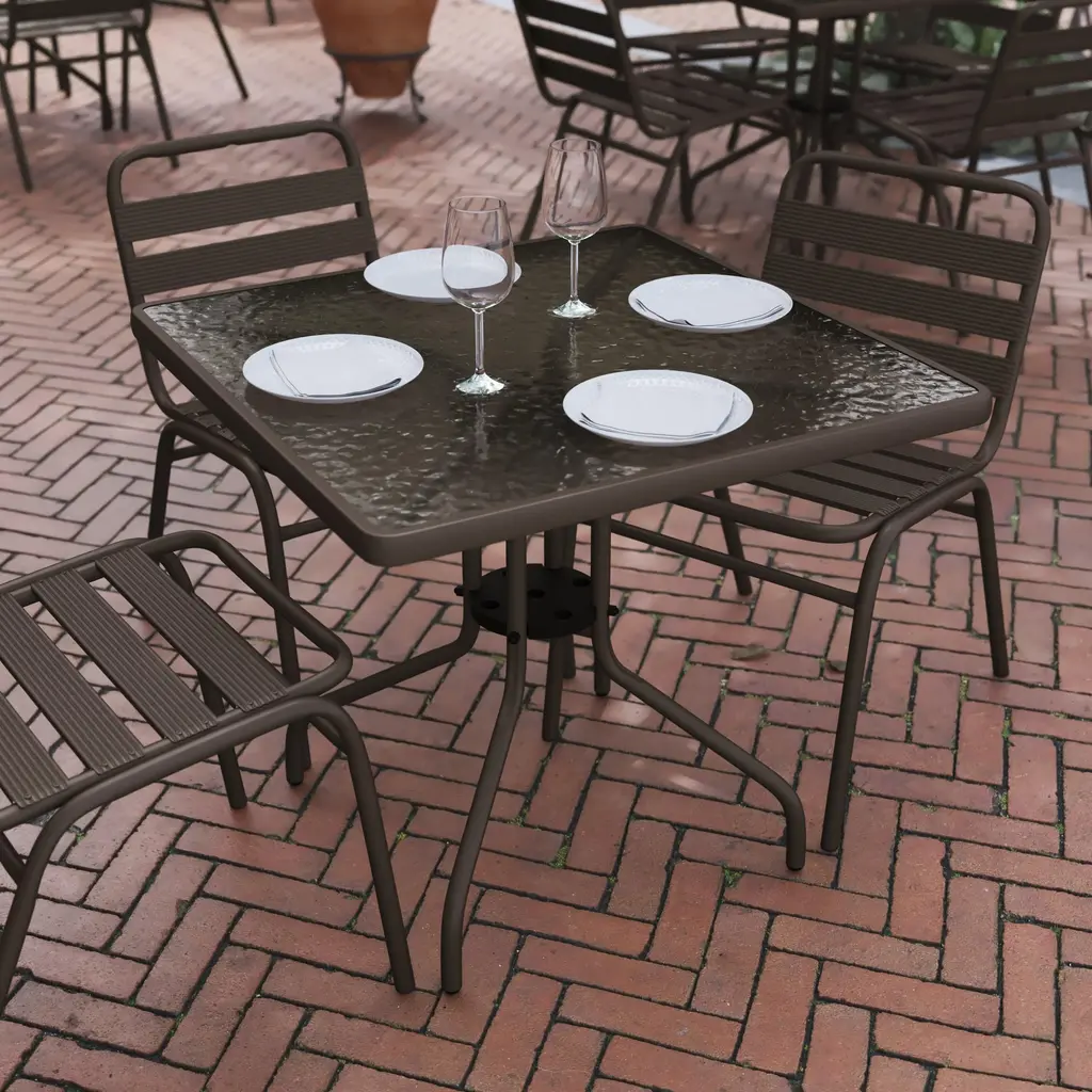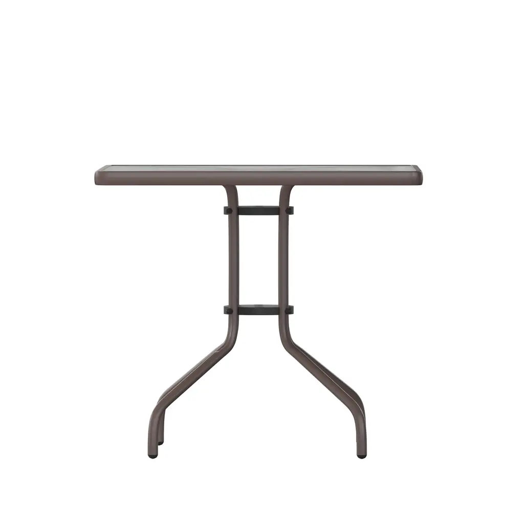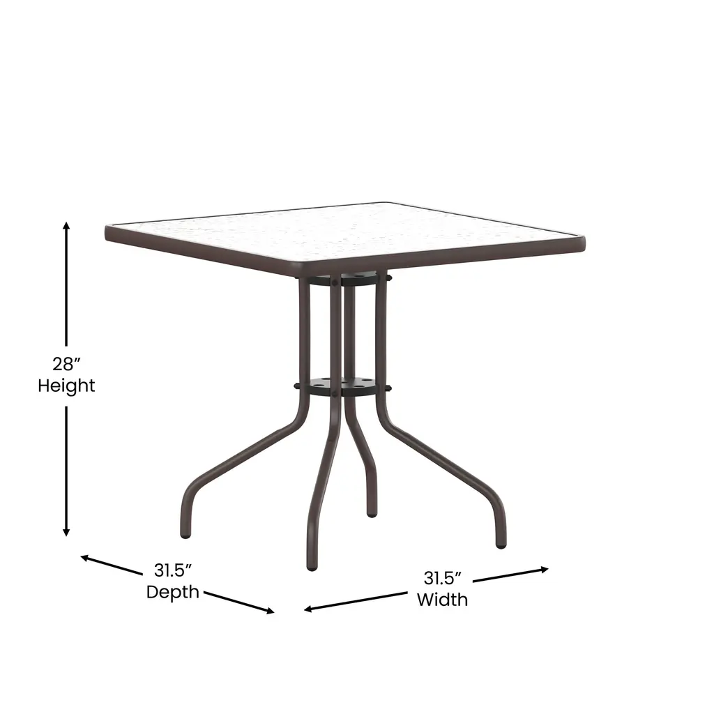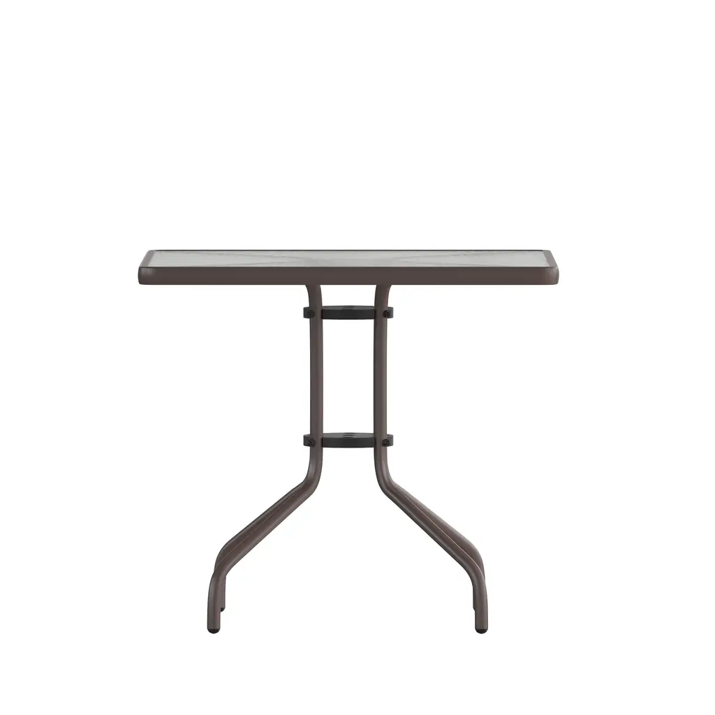 Whether adding some much needed real estate to hold drinks and snacks on the patio at home or a place for patrons to relax, have a meal and great conversation, this tempered glass and metal table can help create the perfect relaxing or entertainment environment. The ripple designed table top features a smooth surface for keeping items level. Enjoy dining outdoors year-round on this bistro patio table designed for all-weather use making it a great option for indoor and outdoor settings. For longevity, care should be taken to protect from long periods of wet weather. The powder coat finish lends the square-shaped table a bold, versatile appearance that matches well with your favorite chairs. This glass table will enhance the look of your bistro, cafe, restaurant, hotel or home patio space.