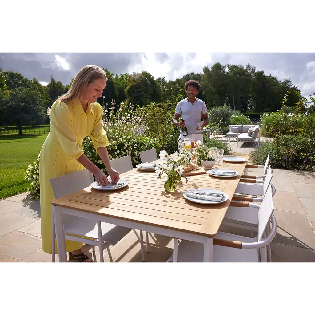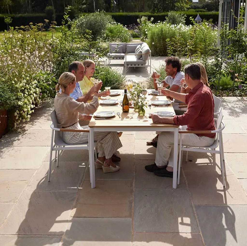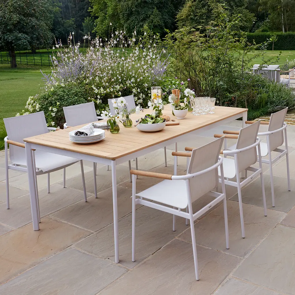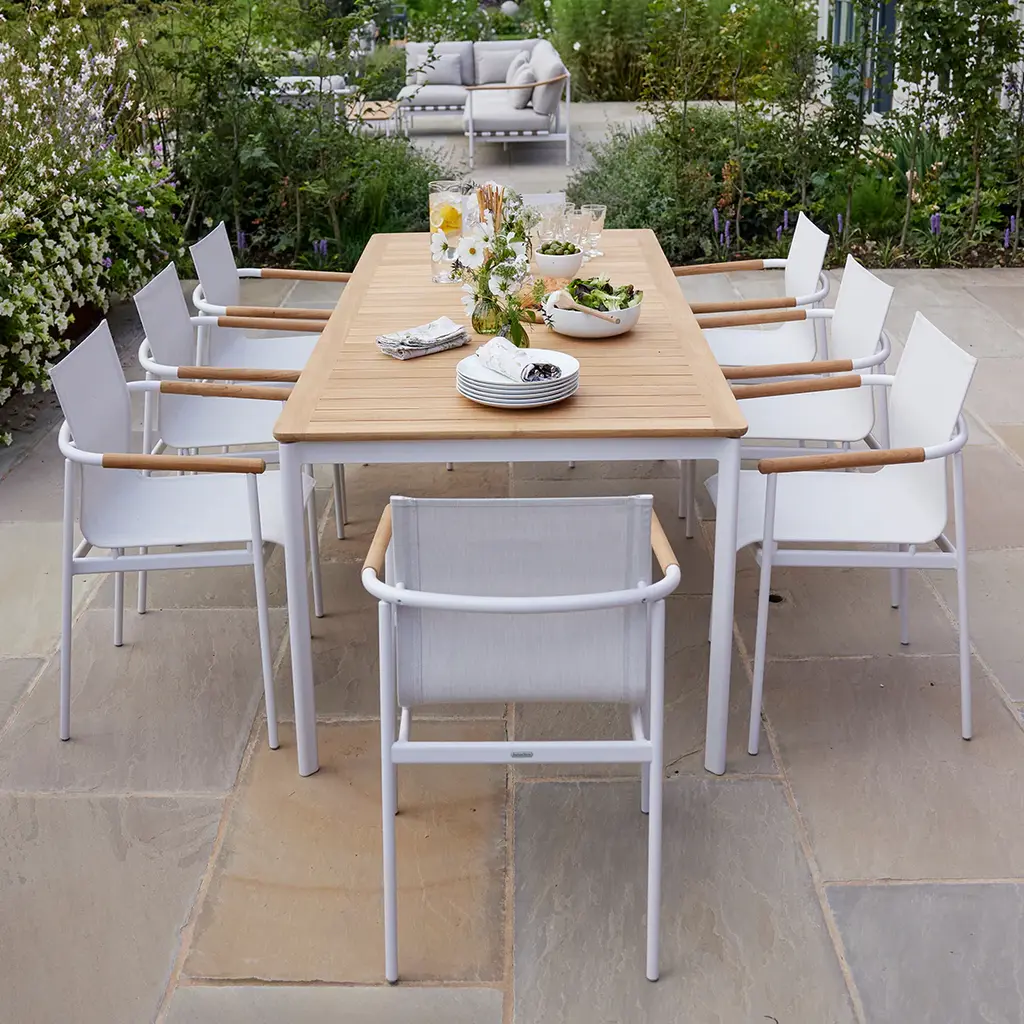 Inspired by designers Nathalie de Leval and Andrew Jones, the Around Dining Collection offers refined powder-coated frames combined with gently curved teak and aluminum arms and well-crafted cushions for superior comfort. The modular deep seating is designed to offer numerous configurations to suit each need. Please Note: Fabrics, canopies, cushions, covers, special order sling colors, and special order finishes are considered customized and may have longer lead times. These items cannot be cancelled, returned, or exchanged.