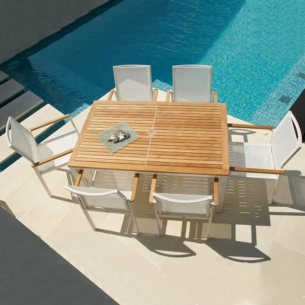 Powder coated aluminum and teak gives this table a more contemporary look. The table top has a thread of aluminum running across it and around the parasol hole. A teak plug is also supplied for when a parasol is not used.Please Note: Fabrics, canopies, cushions, covers, special order sling colors, and special order finishes are considered customized and may have longer lead times. These items cannot be cancelled, returned, or exchanged.