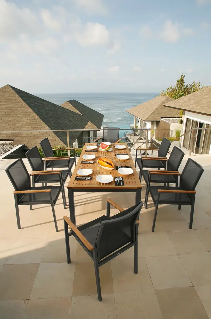 Powder coated aluminum and teak gives this table a more contemporary look. The table top has a thread of aluminum running across it and around the parasol hole. A teak plug is also supplied for when a parasol is not used.Please Note: Fabrics, canopies, cushions, covers, special order sling colors, and special order finishes are considered customized and may have longer lead times. These items cannot be cancelled, returned, or exchanged.