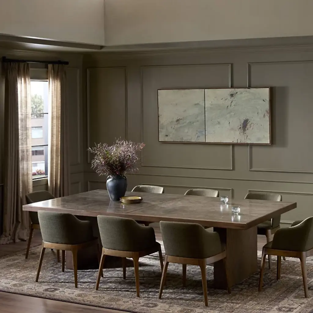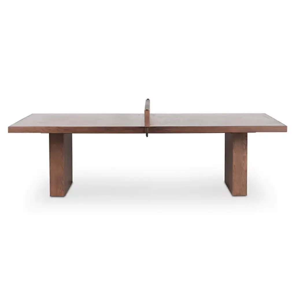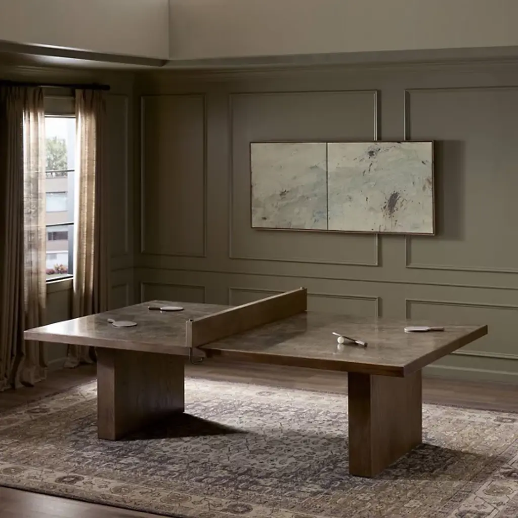 The Bato Ping Pong Table from Four Hands merges recreation with refined dining through its ingenious dual-purpose design that celebrates both playfulness and sophistication. Two expansive slabs of warm grey marble, beautifully framed in rich oak, join seamlessly together above minimalist plinth bases. The wooden net attaches with custom gunmetal clamps that remove easily, transforming the game table into an impressive dining surface that comfortably seats twelve guests. This remarkable piece proves that furniture can be elegantly designed and multifunctional, bringing sophisticated recreation to contemporary homes.
