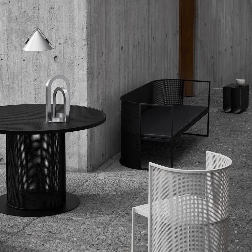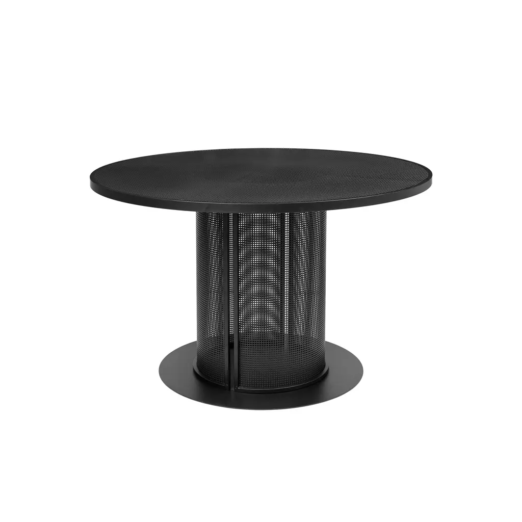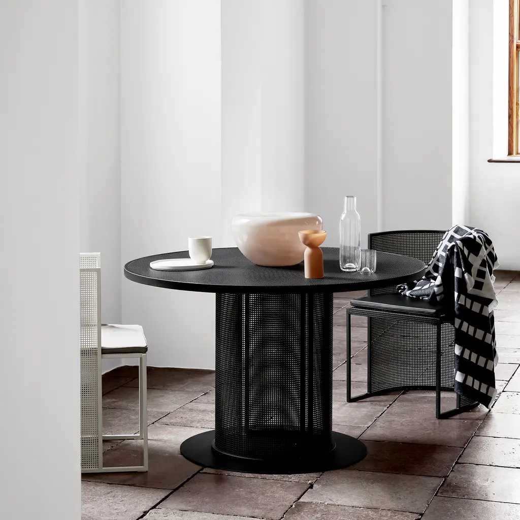 Bring high-end design to any outdoor space with the Kristina Dam Studio Bauhaus Dining Table. Inspired by the minimalist style of the iconic German design school, this table combines pure geometric shapes. The column-like base provides support to the circular top, creating a play between rounded forms. Made with the collection’s signature perforated stainless steel material, this dining table filters the light and is partly see-through, enhancing the visual impact of the design. The powder-coated finish protects the stainless steel from the elements and corrosion, ensuring that the table lasts in outdoor spaces, whether it’s a covered patio at home or restaurant’s terrace. Matching dining chairs from the same collection are also available, along with a trolley. Please keep in mind that while the powder-coated finish protects the stainless steel from corrosion and water damage, scratches may occur over time and expose the material to the elements.