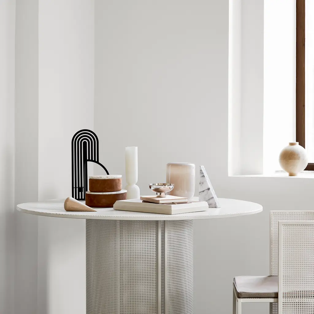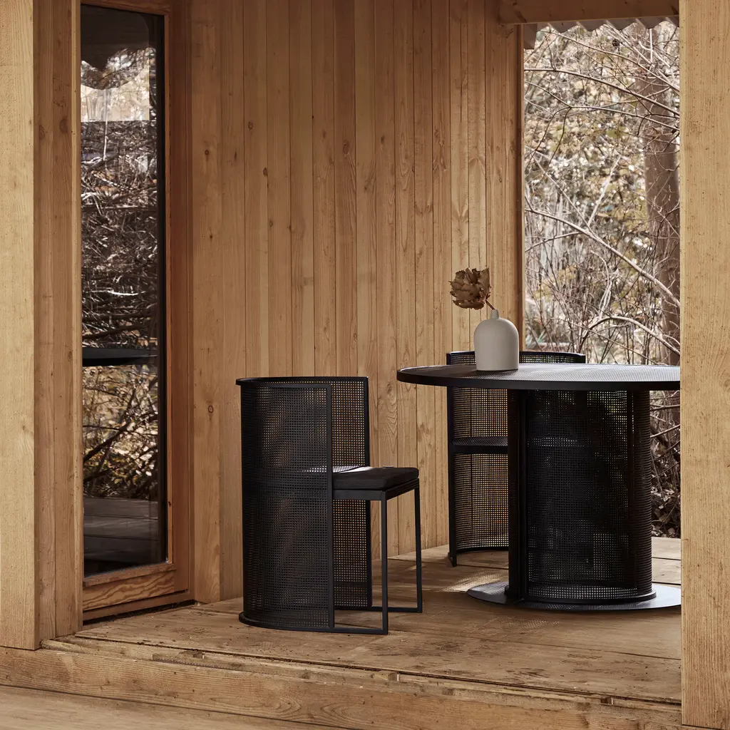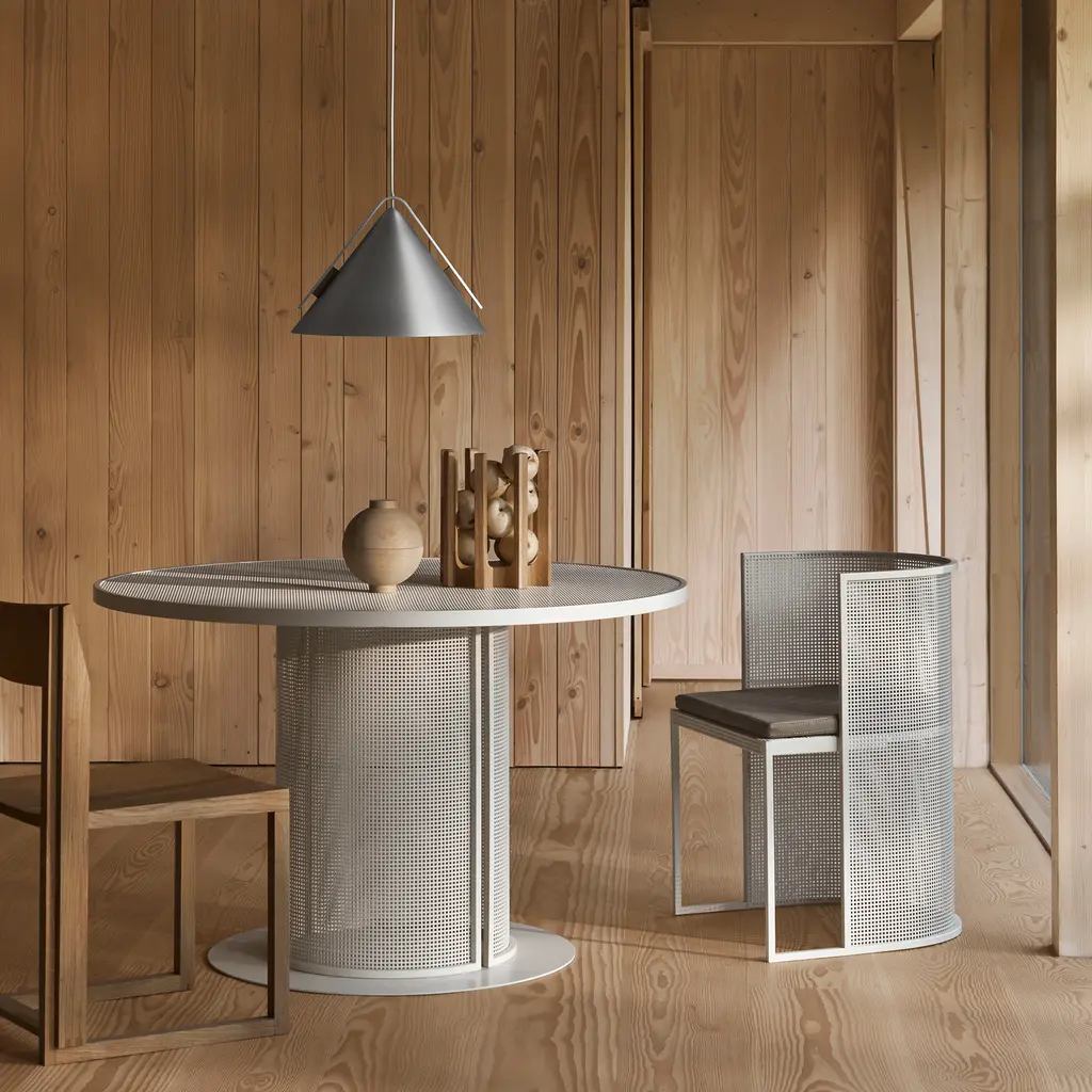 Bring high-end design to any outdoor space with the Kristina Dam Studio Bauhaus Dining Table. Inspired by the minimalist style of the iconic German design school, this table combines pure geometric shapes. The column-like base provides support to the circular top, creating a play between rounded forms. Made with the collection’s signature perforated stainless steel material, this dining table filters the light and is partly see-through, enhancing the visual impact of the design. The powder-coated finish protects the stainless steel from the elements and corrosion, ensuring that the table lasts in outdoor spaces, whether it’s a covered patio at home or restaurant’s terrace. Matching dining chairs from the same collection are also available, along with a trolley. Please keep in mind that while the powder-coated finish protects the stainless steel from corrosion and water damage, scratches may occur over time and expose the material to the elements.