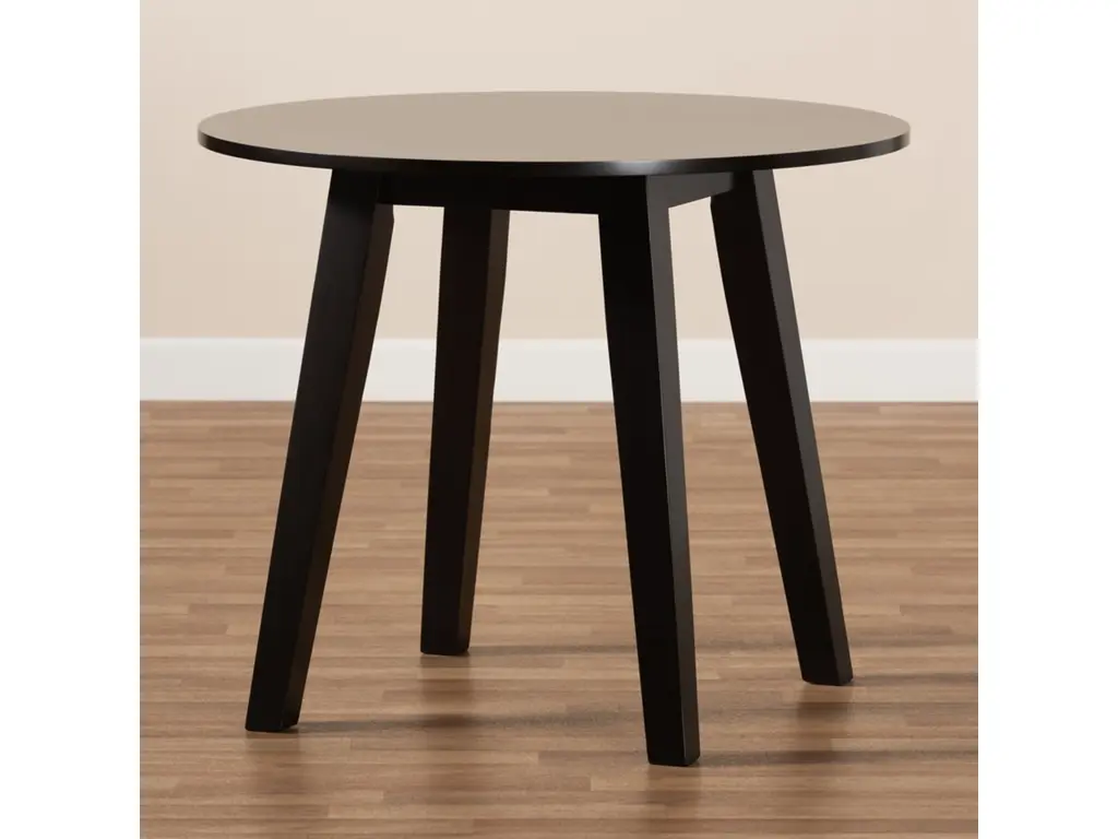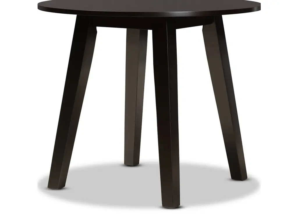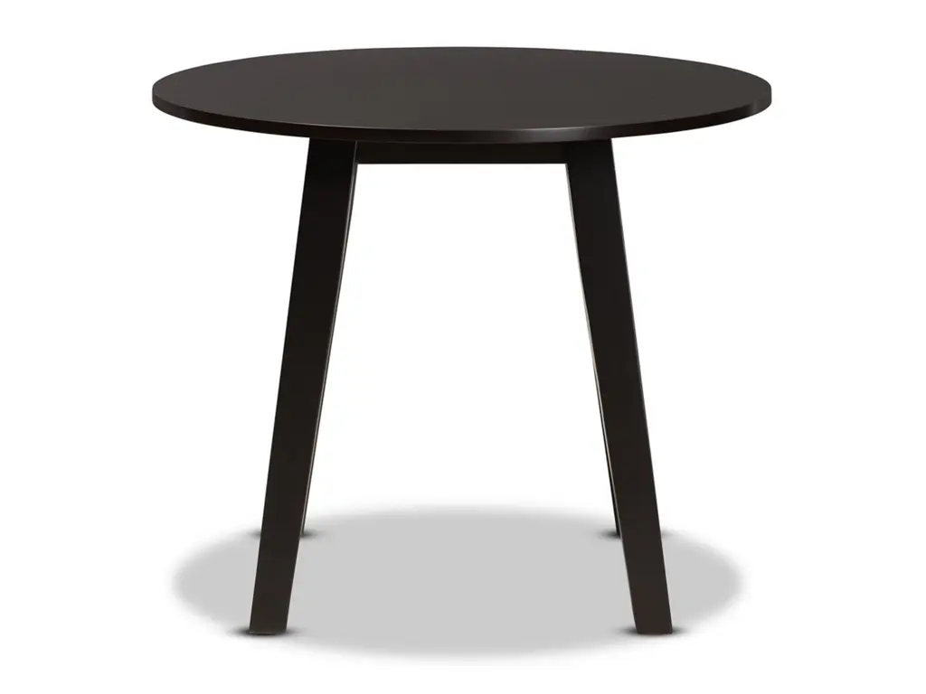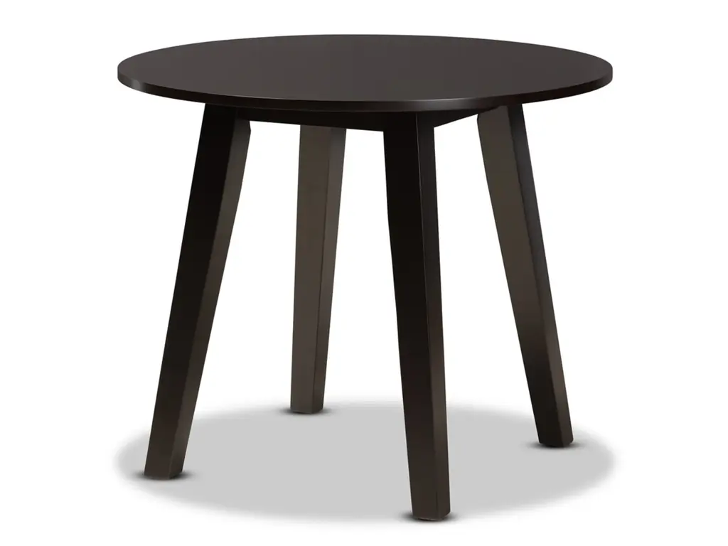 Featuring a modern profile and sleek finish, the Ela dining table brings style to any dining space. This dining table is built from sturdy wood and comfortably seats up to four. A dark brown finish and round tabletop give the table a contemporary look while also providing ample elbow room for each member of the table. Splayed legs create a chic profile from any angle. This dining table is well suited for both casual and formal dining.