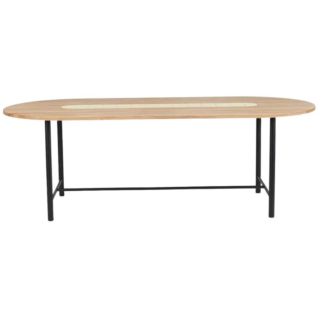 Be My Guest Dining Table 240 Black Oak Forrest Green by Warm NordicDimensions: D220 x W100 x H73 cmMaterial: Black oiled solid oak, Forrest green tiles, Black noir powder coated steel FrameWeight: 32 kgAlso available in different colours and dimensions. Please contact us.Elegant dining table with a remarkable wooden top with tile inlay and a light metal frame. This beautiful dining table is the natural and cosy gathering point for family and friends and thanks to its rounded shape, you will always have room for one more guest. The design is inspired by the traditional tile-topped table and has been brought into the present with a focus on quality and craftsmanship. Style and functionality go hand in hand as you can place your teapot or coffee plunger on the row of tiles at the centre of the table. The dining table can be used together with the bench from the same range to accommodate more people and with dining chairs - or perhaps both. Be My Guest comes in two sizes and is available in oak for a warm and unique look. Choose between various finishes and tiles in a range of beautiful colours from the Warm Nordic universe.Warm Nordic is an ambitious design brand anchored in Nordic design history and with a timeless, aesthetic style that inspires you to appreciate the little things in life. The company is the result of several years’ intense work on developing a new design brand with design history, quality and personality at its core. Warm Nordic boasts a colourful and charming universe of furniture, lamps and accessories full of personality. Our designs encapsulate the Nordic spirit, which in its essence is timeless, inclusive and warm.