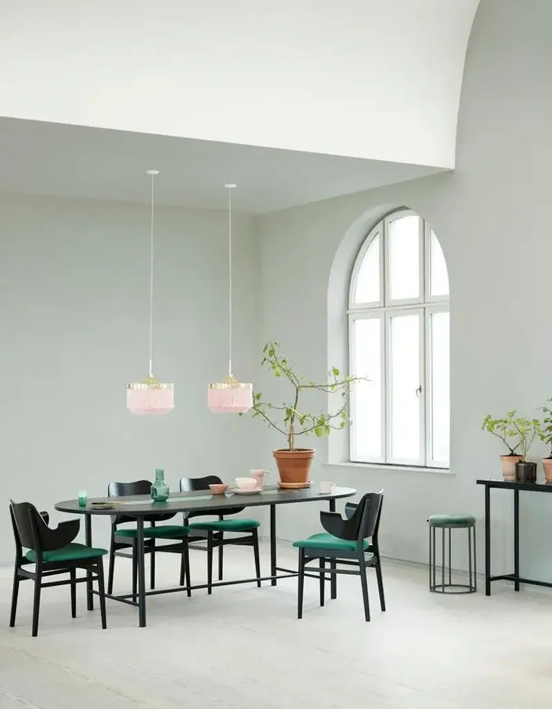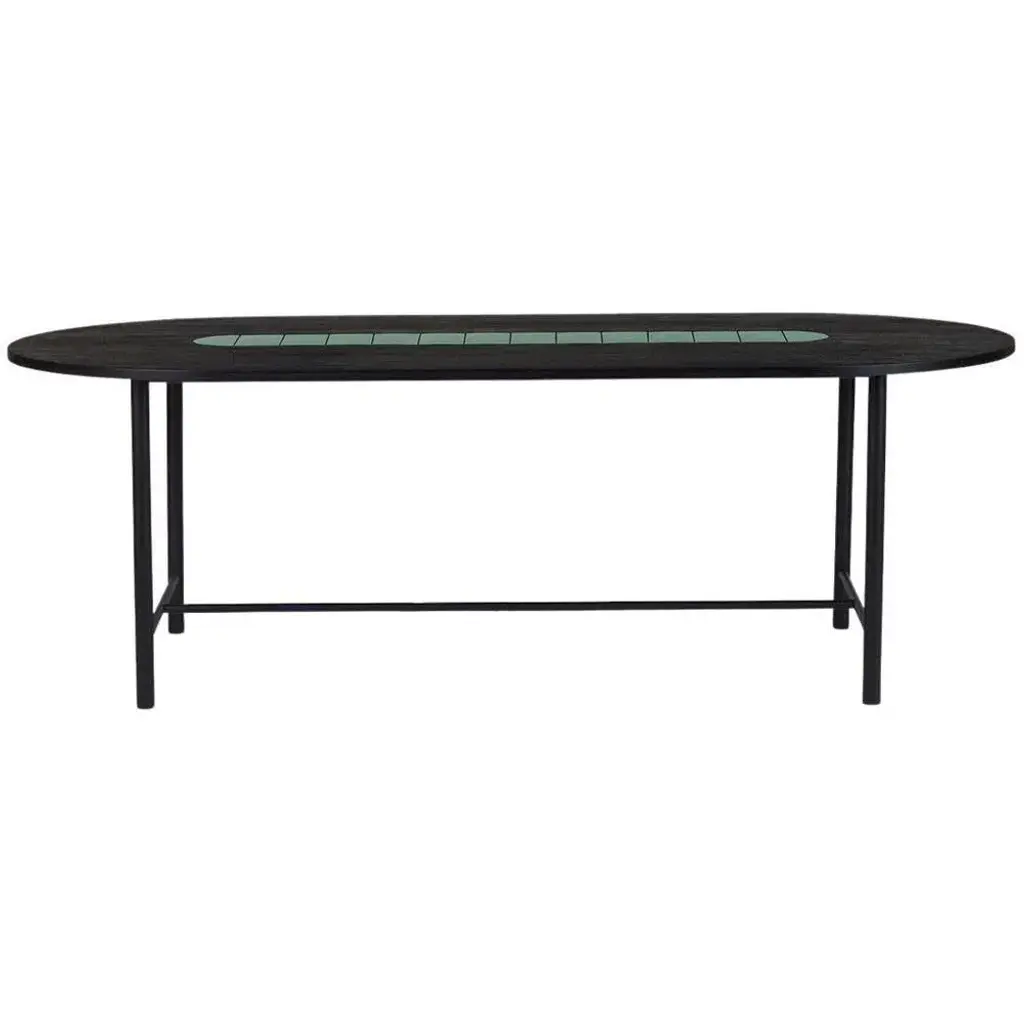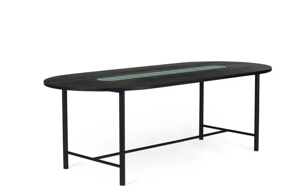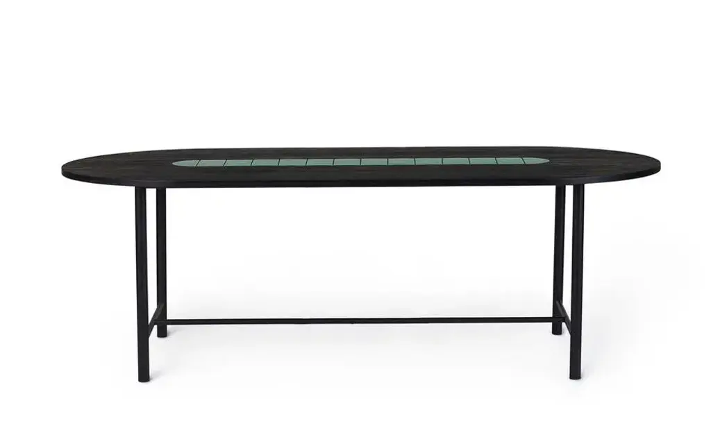 Be My Guest Dining Table 240 Black Oak Forrest Green by Warm Nordic Dimensions: D220 x W100 x H73 cm Material: Black oiled solid oak, Forrest green tiles, Black noir powder coated steel Frame Weight: 32 kg Also available in different colours and dimensions. Please contact us. Elegant dining table with a remarkable wooden top with tile inlay and a light metal frame. This beautiful dining table is the natural and cosy gathering point for family and friends and thanks to its rounded shape, you will always have room for one more guest. The design is inspired by the traditional tile-topped table and has been brought into the present with a focus on quality and craftsmanship. Style and functionality go hand in hand as you can place your teapot or coffee plunger on the row of tiles at the centre of the table. The dining table can be used together with the bench from the same range to accommodate more people and with dining chairs - or perhaps both. Be My Guest comes in two sizes and is available in oak for a warm and unique look. Choose between various finishes and tiles in a range of beautiful colours from the Warm Nordic universe.