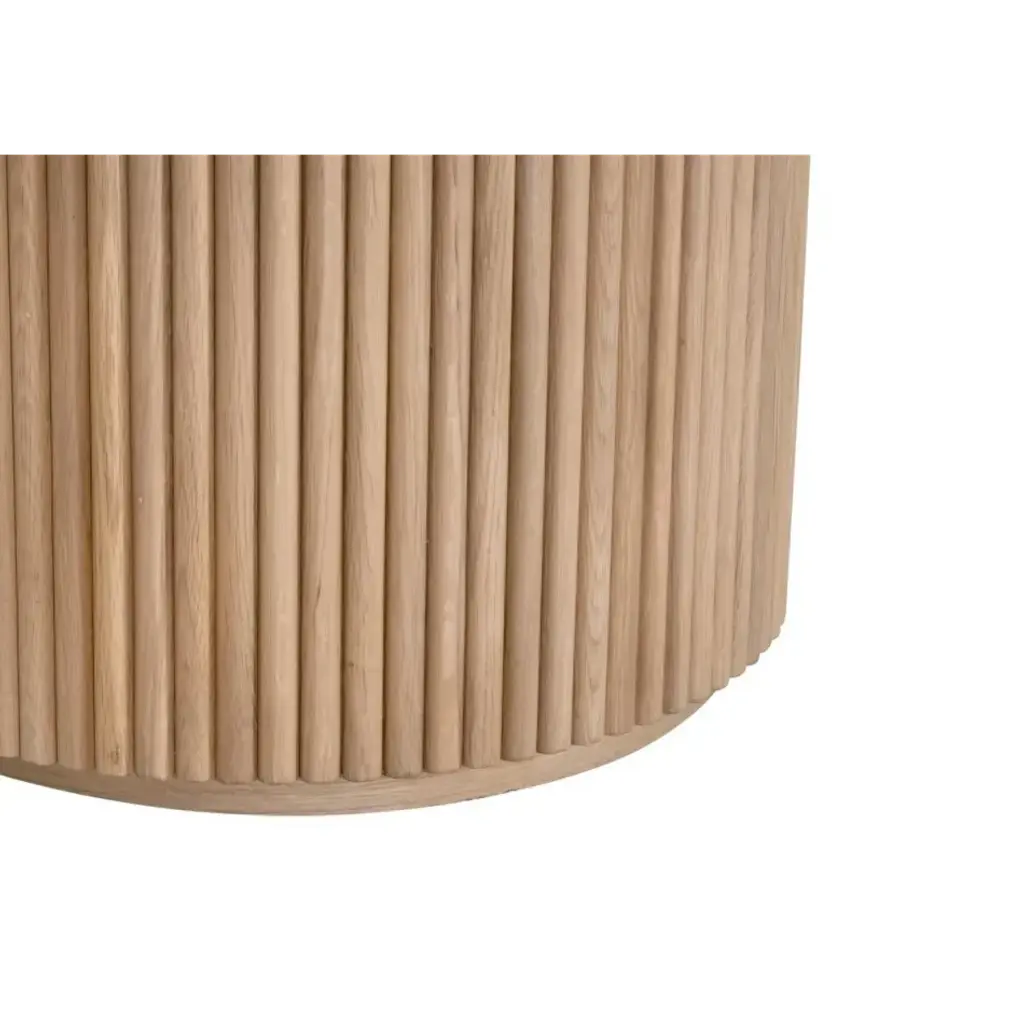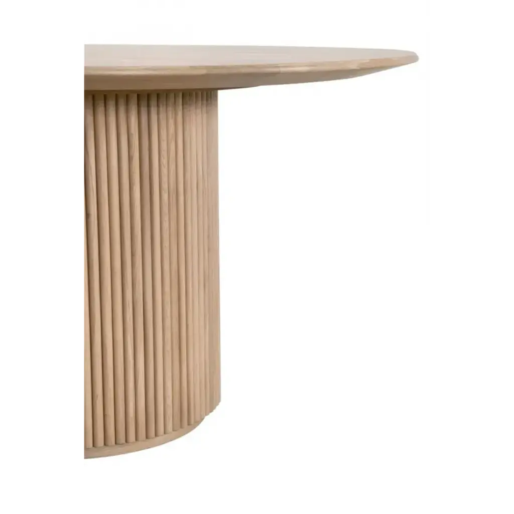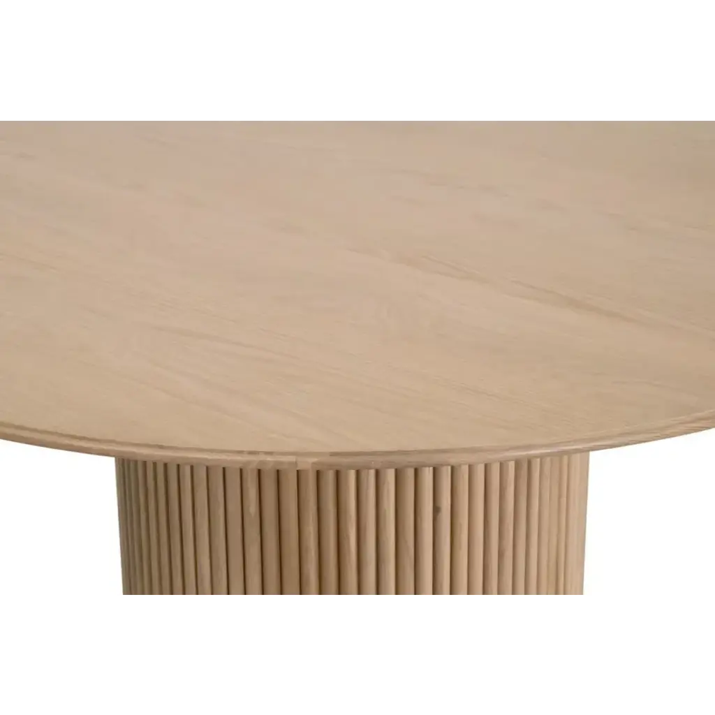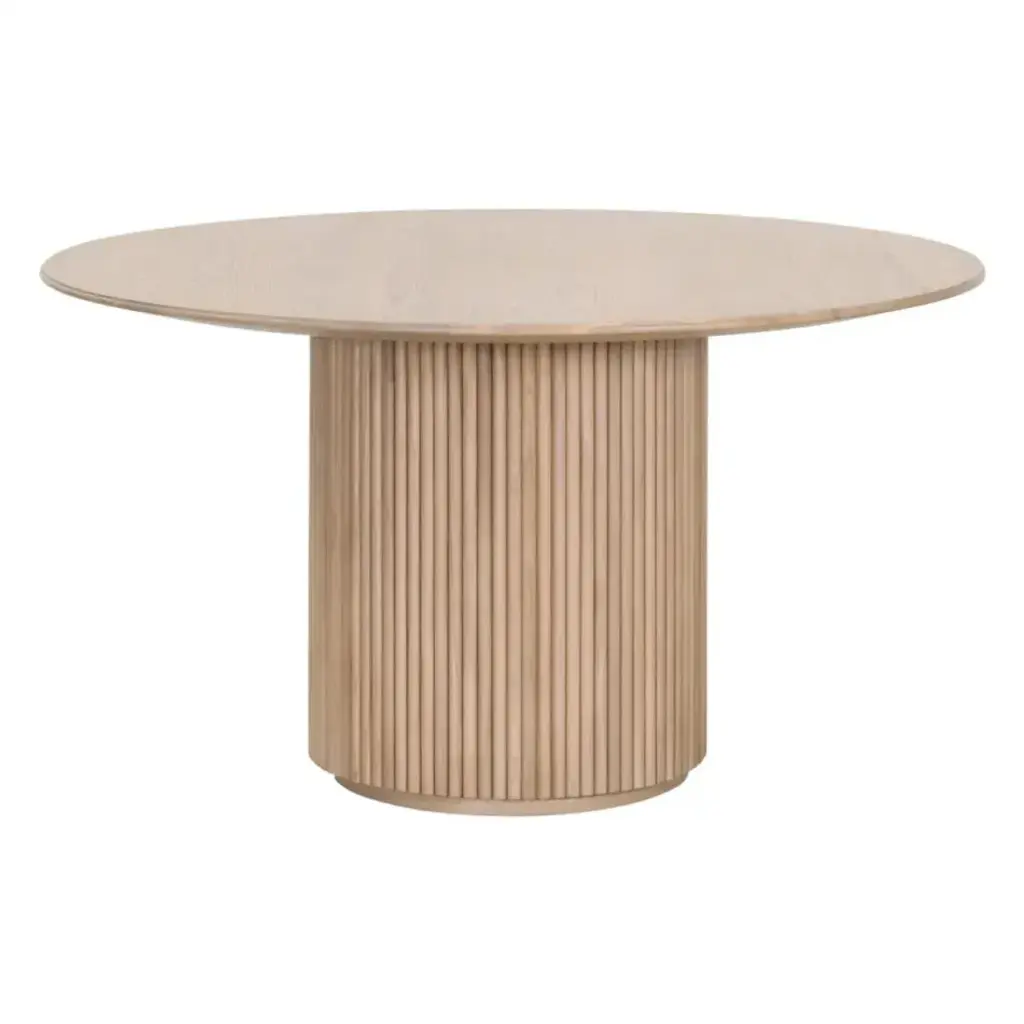 Designed to bring timeless elegance to your dining space, this Belfast 54" Round Dining Table by Essentials For Living features a natural oak finish that enhances the beauty of its solid oak wood and oak veneer construction. The pedestal base showcases decorative wood fluting, adding texture and visual appeal, while the plinth base provides stability and a modern touch. With a generous 54" diameter and 29.75†height, it comfortably seats up to four, making it perfect for intimate gatherings or family meals. Its transitional style effortlessly complements a wide range of interiors, including smaller spaces.