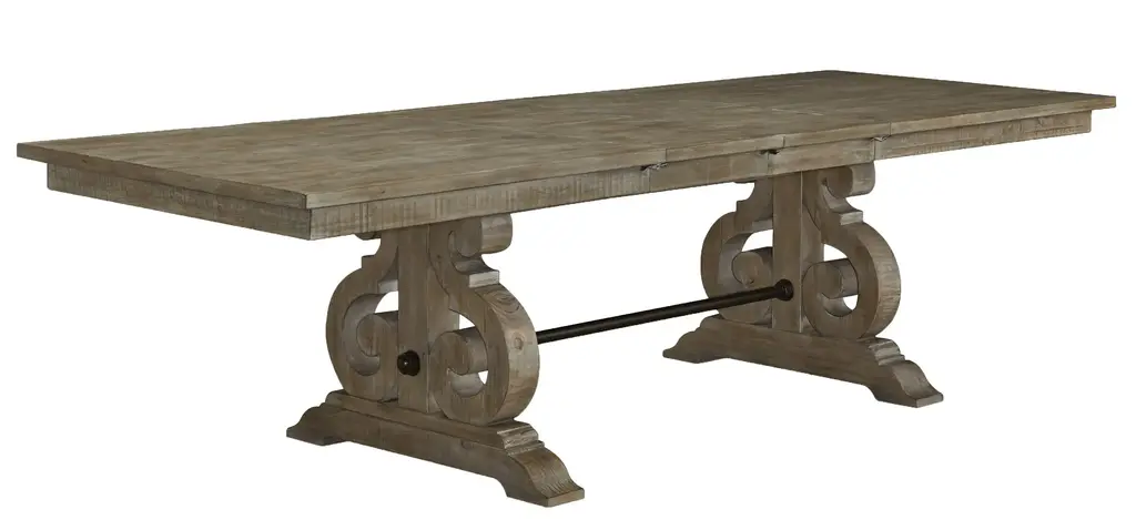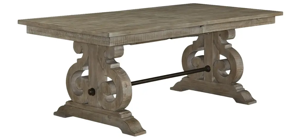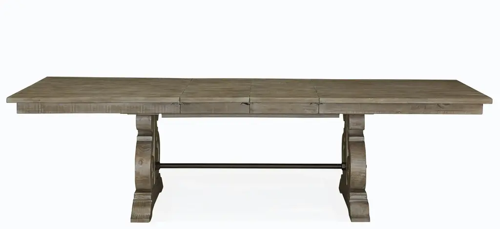 Mediterranean influences create an elegantly approachable and a welcoming feeling with the Bellamy dining collection. A rustic finish lends a rich hue to the pine solids and veneers with handsome pewter hardware and accents.