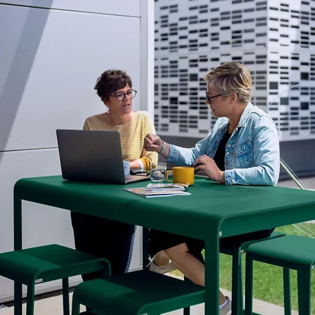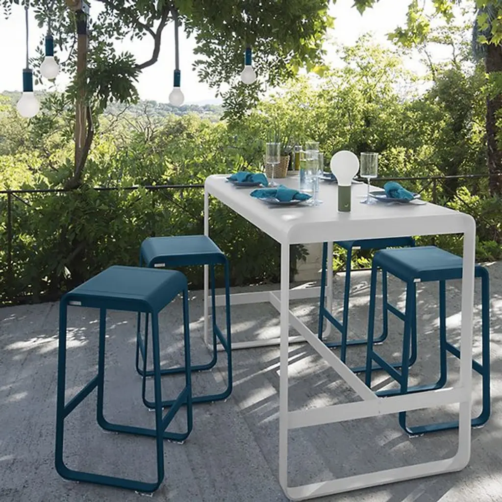 Achieve great new heights in stylish outdoor dining. The Bellevie High Table by Fermob, designed by Pagnon & Pelhaître Design, offers a smooth, modern look as well as great stability for bar-height drinks and nibbles. It features a flat aluminum bar frame paired with a tough, electro-galvanized steel top. A polyester powder coat finish adds even greater durability against the elements, and it helps to make this table the eye-catching centerpiece you want outside.