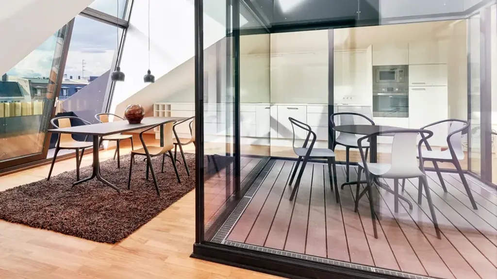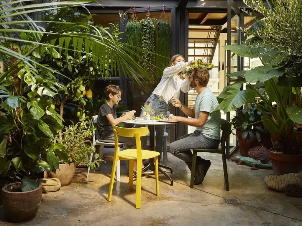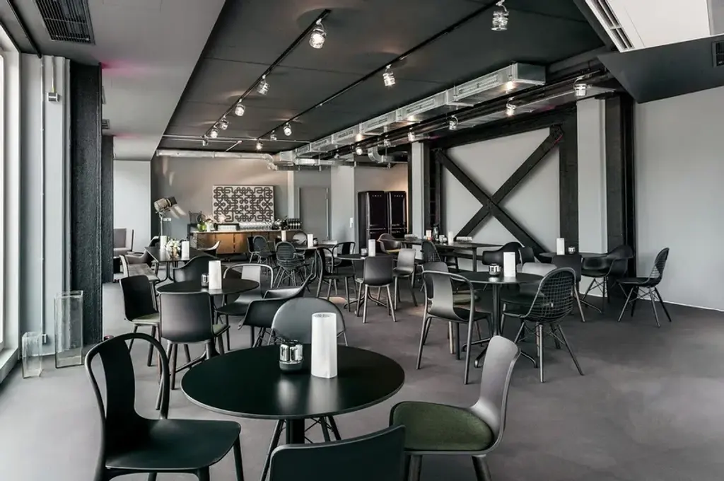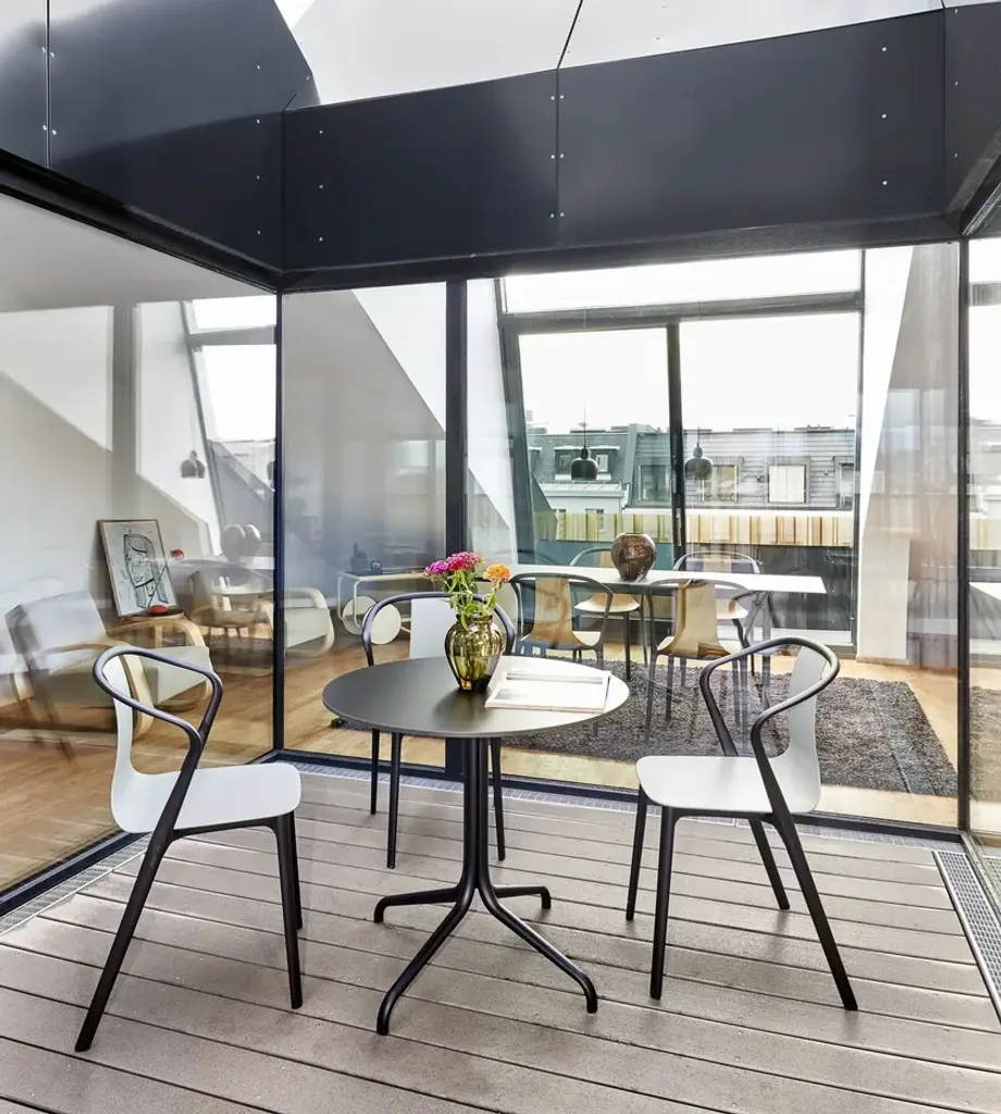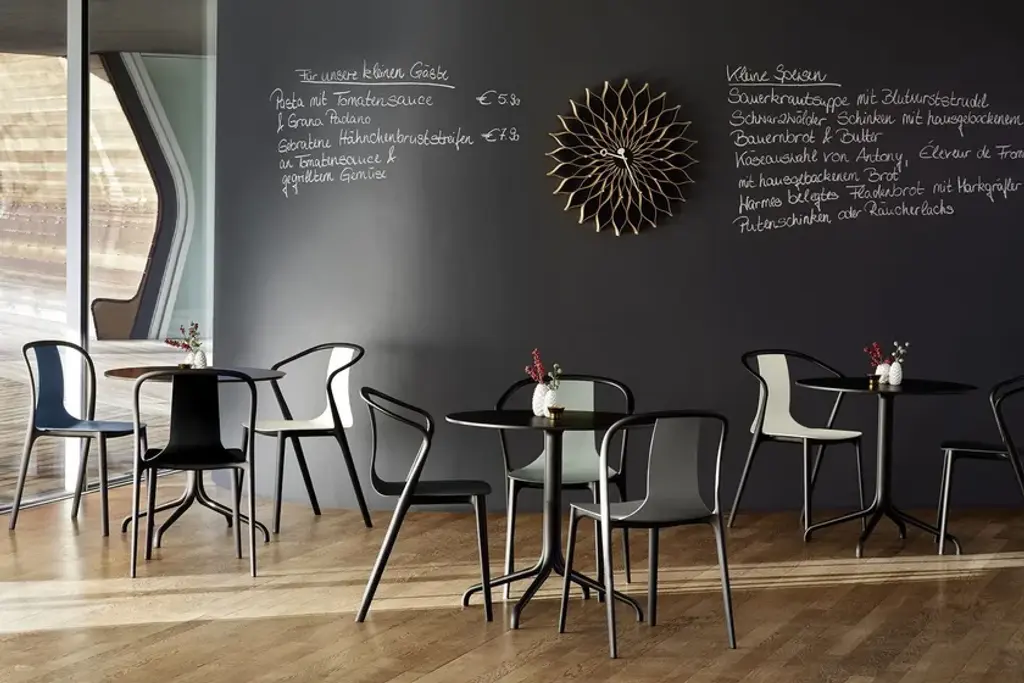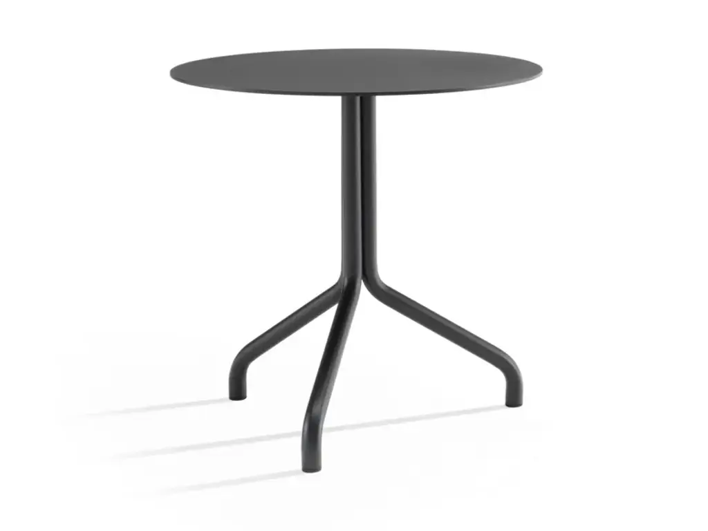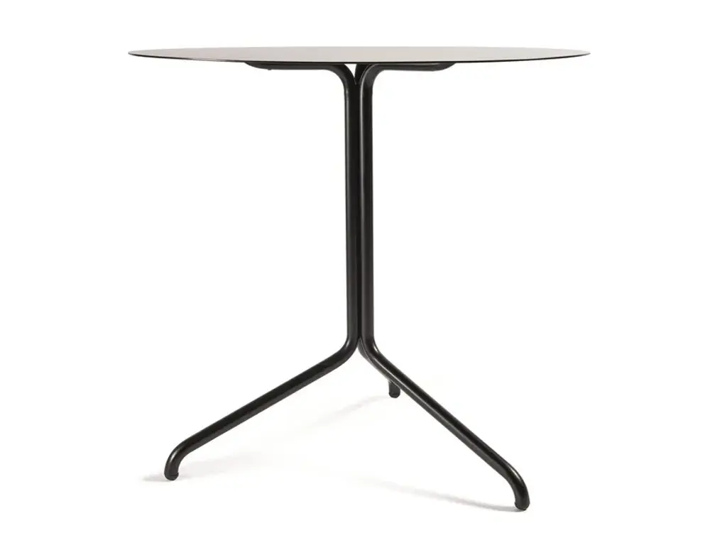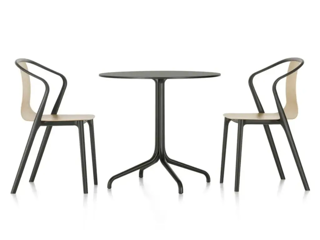Belleville Bistro is a round table with 4-star steel base and wooden top.The Belleville Tables are modelled on the typology of the classic bistro table, but thanks to the selection of solid wood, veneer, melamine or HPL table tops, their appearance is highly variable. The slender legs flow in a continuous sweeping line from the splayed bottom along the central column to the table top. In star-shaped or paired configurations, they form bases for small and large bistro tables or dining tables.The colour and surface texture of the cast aluminium table legs, which have a black powder-coated finish, are nearly indistinguishable from the plastic frame of the perfectly matched Belleville Chair. And since the materials of the table tops and seat shells are either identical or harmoniously coordinated, the tables and chairs form a unified yet diverse group - a hybrid family of furnishings whose materiality resists classification. Thus the tables can be ideally combined with Belleville Chairs in bustling bistro settings as well as in sleekly modern galleries or diversely styled home environments.The Belleville Table is available as a small square or round bistro table with a star-shaped base or as a bistro and dining table in different widths and lengths with slightly arched T-legs. Depending on the model, the table tops come in solid wood, wood veneer, melamine or solid core material.Material description- Table top: oak veneer in natural or dark oak (20 mm); melamine faced in white with smooth straight plastic edge (19 mm); or solid core material with black edge (12 mm) in the colours white or black. Solid core table top in black with anti-fingerprint coating.- Base: powder-coated with finely textured finish in deep black (RAL 9005). The height of the base including screw-in glides is 720 mm; the glides can be adjusted (max. extension 10 mm) for levelling on uneven floors.- Applications: table with top in solid core material and powder-coated base is suited for outdoor use. The powder-coated bases are pre-galvanised.
