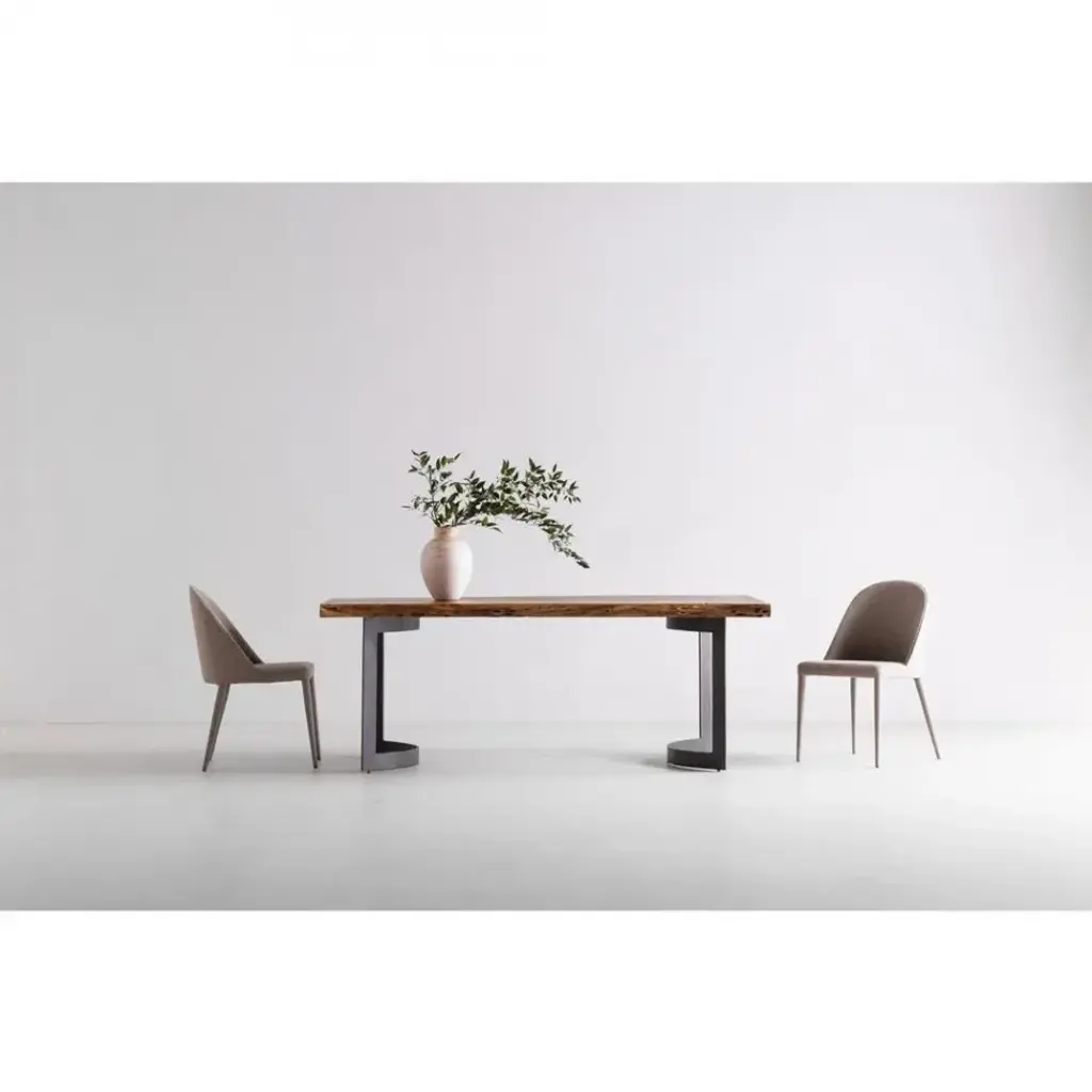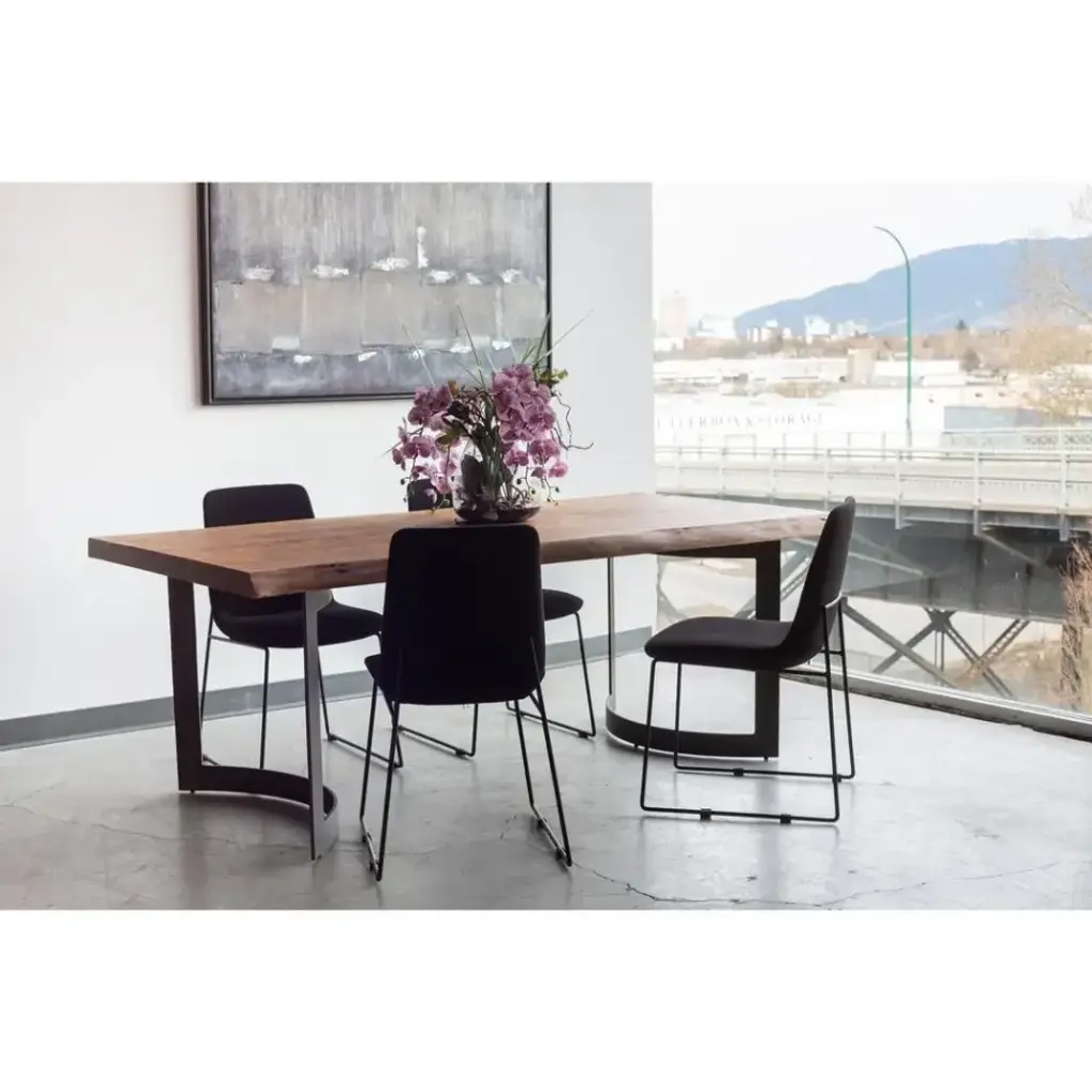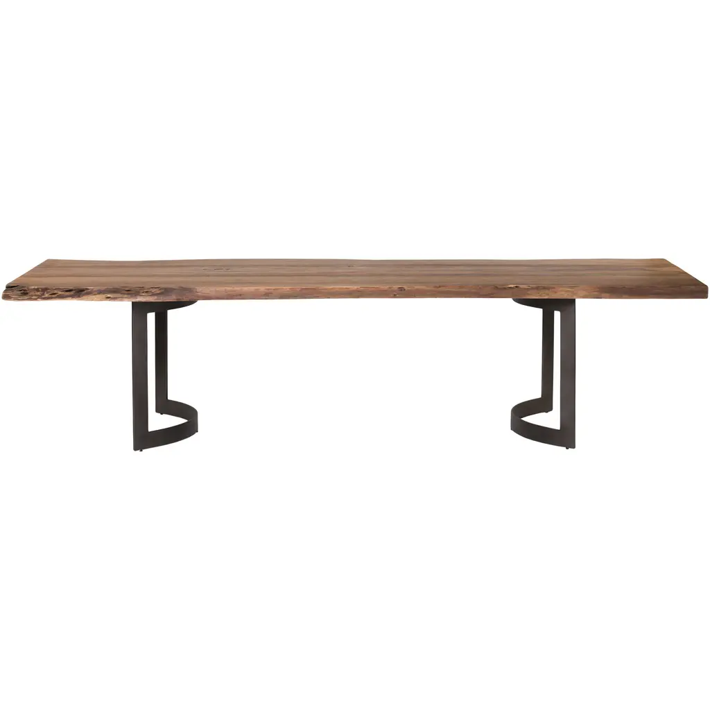 A celebration of nature's artistry, the Bent dining table is expertly crafted from solid acacia wood, exquisitely highlighting the wood's unique knots and whorls through its rustic live edge detailing. Extra small in size, this table's expansive surface features a substantial 2" thickness that gracefully displays the wood's distinct character, while a robust industrial metal base provides a striking contrast.