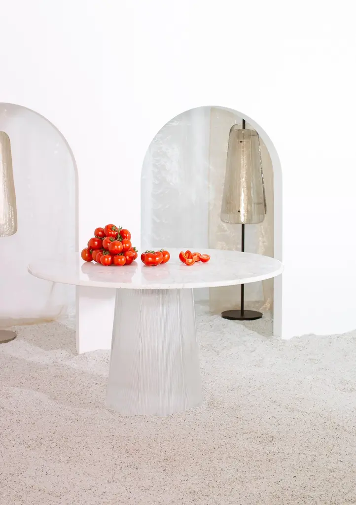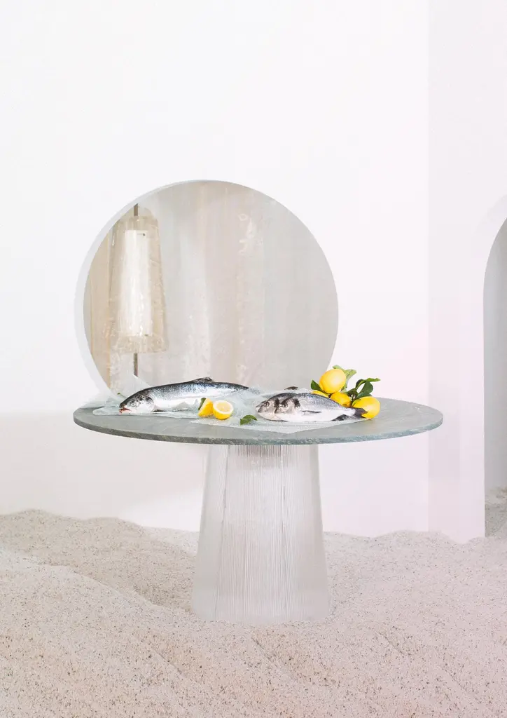 Bent dining table medium black smoky grey by PulpoDimensions: D130 x H74 cm.Materials: casted glass, carrara, black nero or light green marble table top.Also available in different finishes and dimensions. Two kinds of material united in one table. Sebastian Herkner’s fine, characteristically bent with its rippled visual has been reinvented as a tough table foot. Its smooth surface and the glass elements merge into one organic ensemble. The result is a series of tables that command a closer look.Pulpo is a design editor for high-end products in the home sector.Design is our passion. Art is our engine. We are fascinated by the craft of the ceramic and glassblowing workshops and are guided by the rough aesthetics of these unique pieces.Pulpo’s philosophy goes back to the idea of ??the “carte blanche”. Our designers and artists develop their designs freely and experimentally. A variety of materials and a weakness for structures are our strengths.The headquarters of pulpo is in Weil am Rhein, near the Swiss border. Consisting of the creative and sales department, warehouse and logistics, this is the think tank for our artists and designers. pulpo’s dealer network extends far beyond Weil am Rhein – from Iceland and Dubai to Australia.Pulpo is movement – is possibility – is passion.In 2006, pulpo was founded by Ursula and Patrick L’hoste as a design brand at the interface between shape and material. pulpo’s conception is to edit lighting, furniture and accessoires on editor’s choice. The company’s focus is to conduct up-and-coming designers and selected manufacturers, using the nature of material’s to form the score. Materials such as ceramics, stone and especially glass, which is pulpo’s primary focus since 2013.