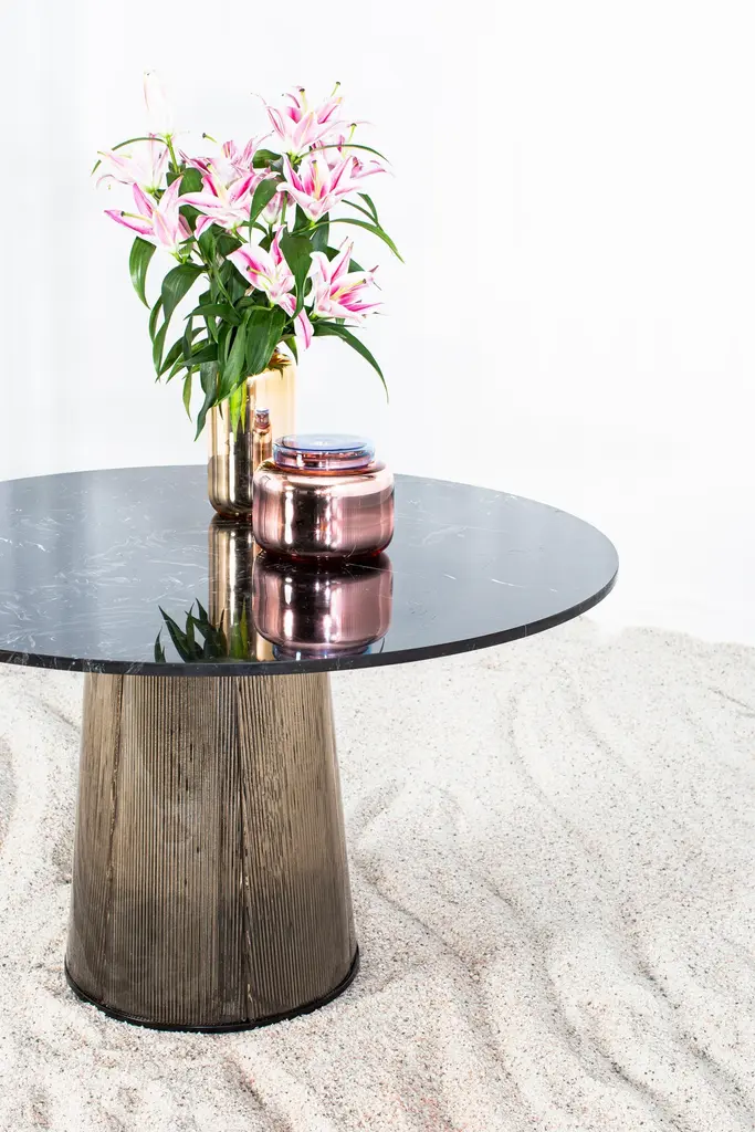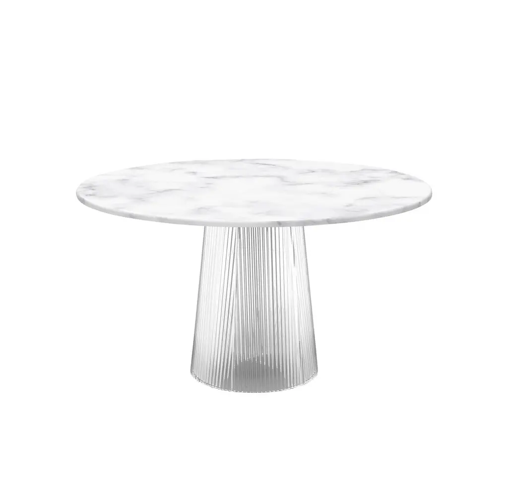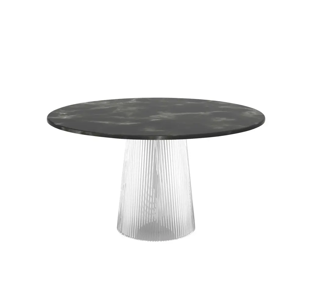 Bent dining table medium white transparent by PulpoDimensions: D 130 x H 74 cmMaterials: casted glass, carrara, black nero or light green marble table top.Also available in different finishes and dimensions.Two kinds of Material united in one table. Sebastian Herkner’s fine, characteristically bent with its rippled visual has been reinvented as a tough table foot. Its smooth surface and the glass elements merge into one organic ensemble. The result is a series of tables that command a closer look.Pulpo is a design editor for high-end products in the home sector.Design is our passion. Art is our engine. We are fascinated by the Craft of the ceramic and glassblowing workshops and are guided by the rough aesthetics of these unique pieces.Pulpo’s philosophy goes back to the IDEA of ??the “carte blanche”. Our designers and artists develop their designs freely and experimentally. A variety of materials and a weakness for structures are our strengths.The headquarters of pulpo is in Weil am Rhein, near the Swiss border. Consisting of the creative and sales department, warehouse and logistics, this is the think tank for our artists and designers. Pulpo’s dealer network extends far beyond Weil am Rhein – from Iceland and Dubai to Australia.Pulpo is movement – is possibility – is passion.In 2006, pulpo was founded by Ursula and Patrick L’hoste as a design brand at the interface between shape and Material. Pulpo’s conception is to edit lighting, furniture and accessoires on editor’s choice. The company’s focus is to conduct up-and-coming designers and selected manufacturers, using the nature of Material’s to form the score. Materials such as ceramics, stone and especially glass, which is pulpo’s primary focus since 2013.