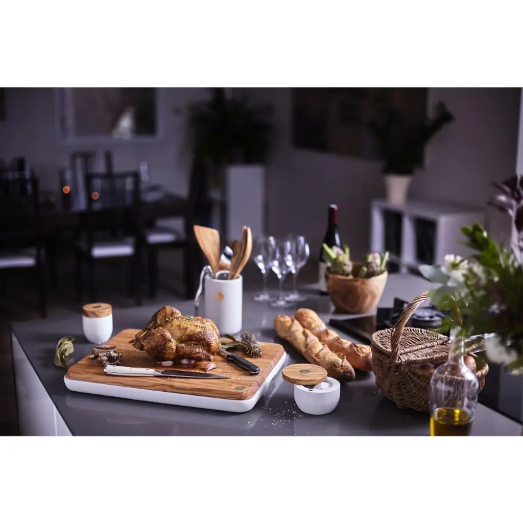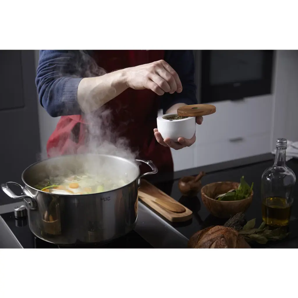 Discover the Berard Round Salt Keeper Millenari Gray—a perfect blend of function and style. Handcrafted from millennial olive wood, this salt keeper showcases the natural beauty of the wood grain. Its compact, round shape fits comfortably in your hand for easy seasoning. The stainless steel lid keeps your salt fresh and protected from moisture. Inside, a non-reactive glaze ensures flavor preservation. The versatile design accommodates different salt varieties. With its classic white color and organic grain patterns, it adds elegance to any kitchen or dining table. Crafted from reclaimed olive wood, it's an eco-conscious choice. Elevate your cooking experience with this exceptional salt keeper.