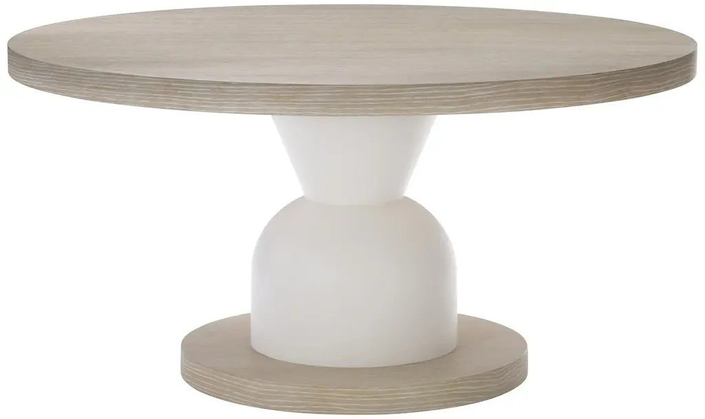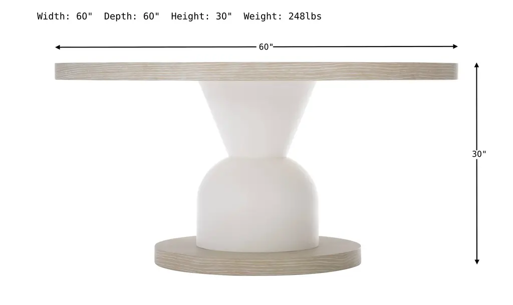 If you are looking for a modern round dining table with a distinctive design that oozes luxury, check out the Bernhardt Solaria round dining table with adjustable glides. The table has a smooth, flat top with a light wood finish that gives it a natural, elegant look. The base of the table is sculptural, composed of two geometric shapes: a truncated cone on top of a rounded, bulbous form, both in a contrasting white finish. The base sits on a circular platform that matches the table top's wood finish and acts as a smaller base, making it look beautiful. The combination of light wood and white elements creates a contemporary look, which makes this dining table suit any interior decor. Grab this one amazing wooden dining table now.