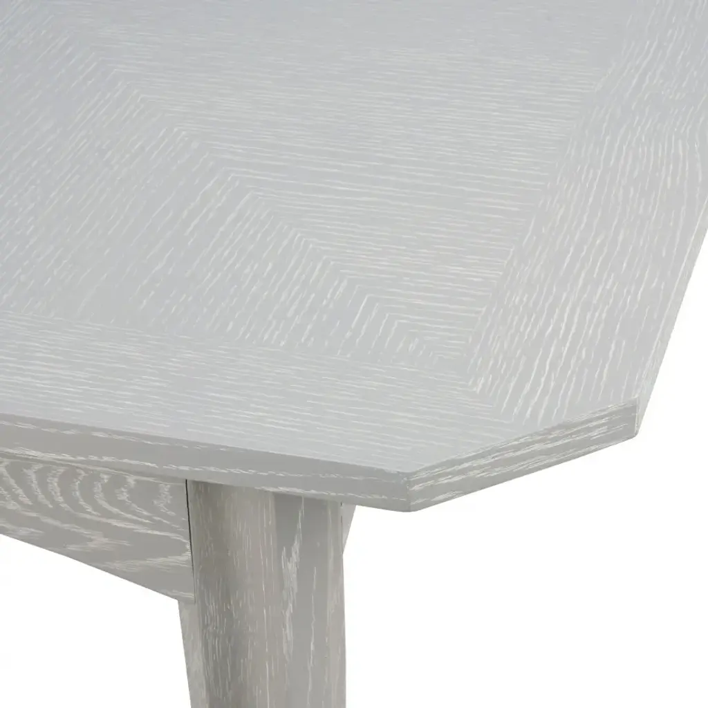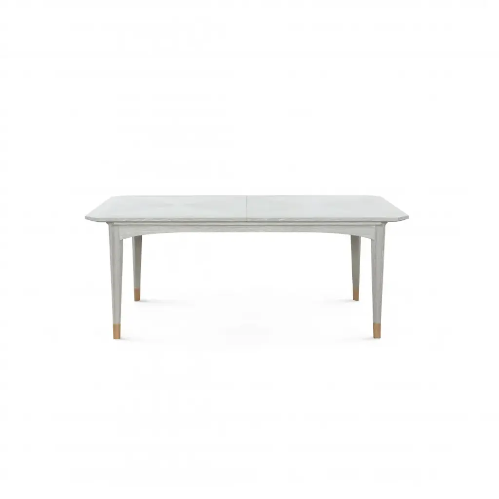 A very elegant piece, the Bertram Dining Table, comes in Soft Gray Clear Lacquered Cerused Oak or in a Sand Clear Lacquered Bleached Cerused Oak. The dining table is extendable with a hidden leaf for when you need to fit more guests or fill a larger space, and has angled corners for a softer look. The legs are made of solid quarter-sawn oak, expertly sanded to taper with double-sided coving, and outfitted with refined bronze sabots. The delicate craftsmanship in the Bertram Collection—like the chevron-pattern oak grain or the coved details—gives each piece a light, elegant presence.